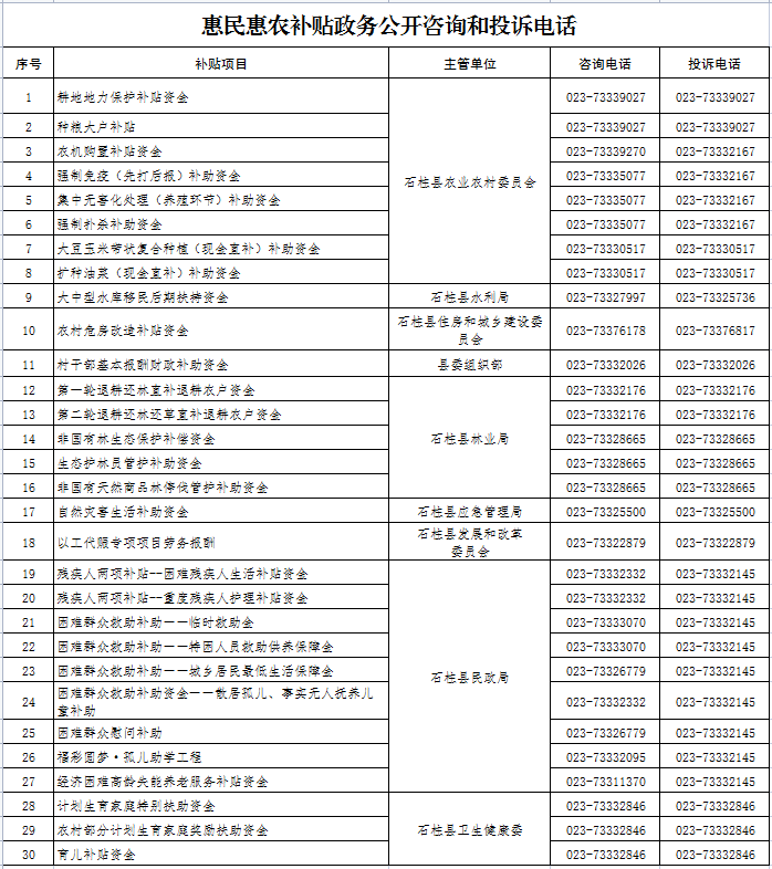 惠民惠农补贴政务公开咨询和投诉电话(2026年)