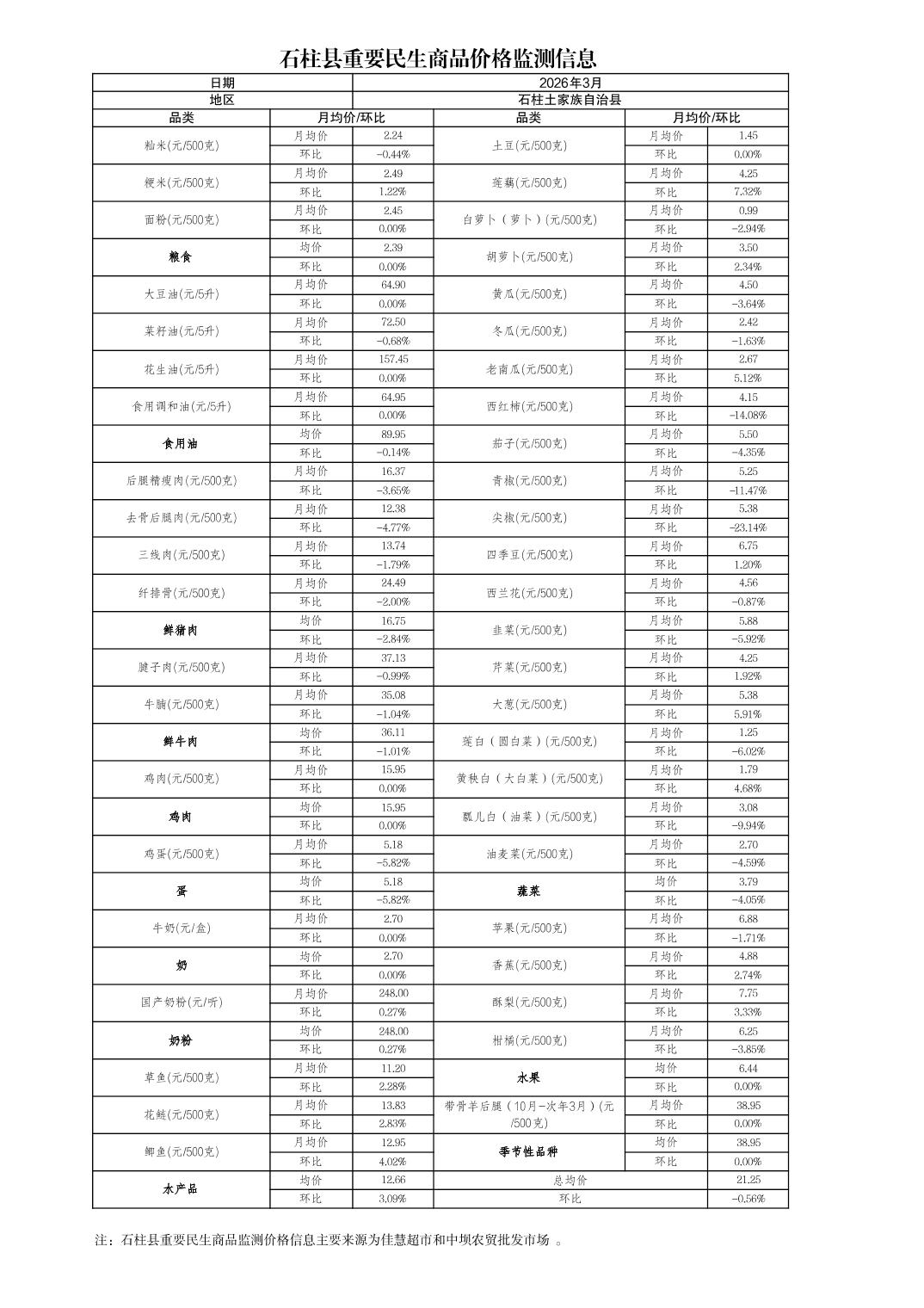 石柱县2026年3月份重要民生商品价格监测信息