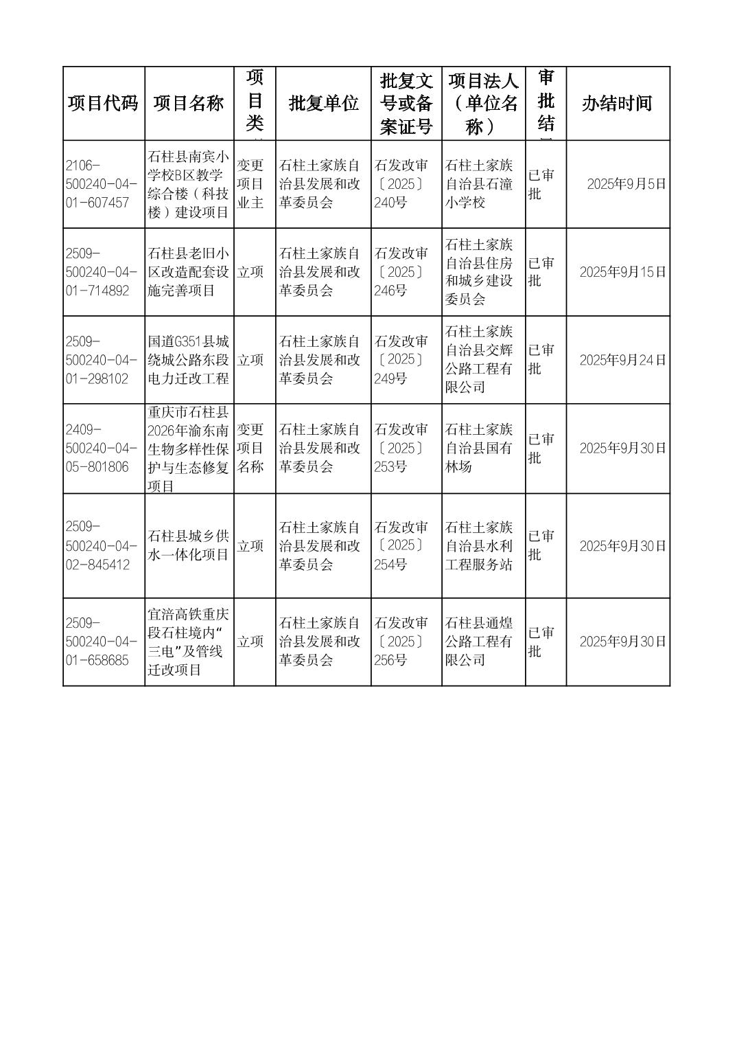 石柱县发展改革委2025年9月重大建设项目政府投资项目建议书(立项)审批表