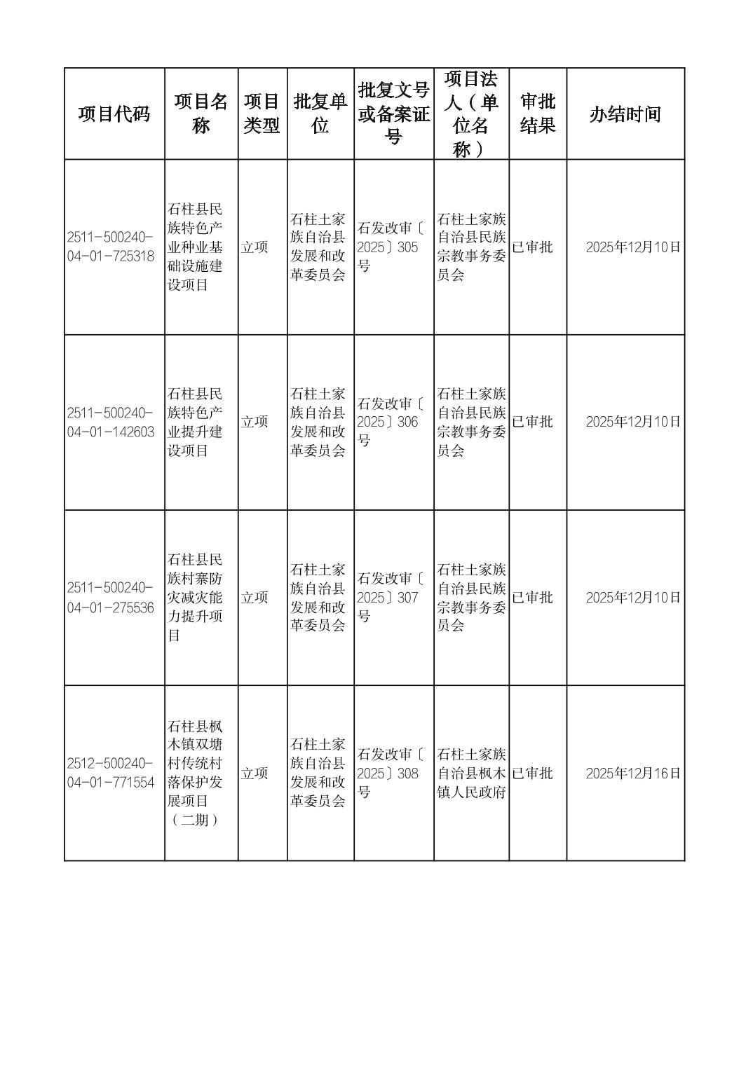 石柱县发展改革委2025年12月重大建设项目政府投资项目建议书(立项)审批表