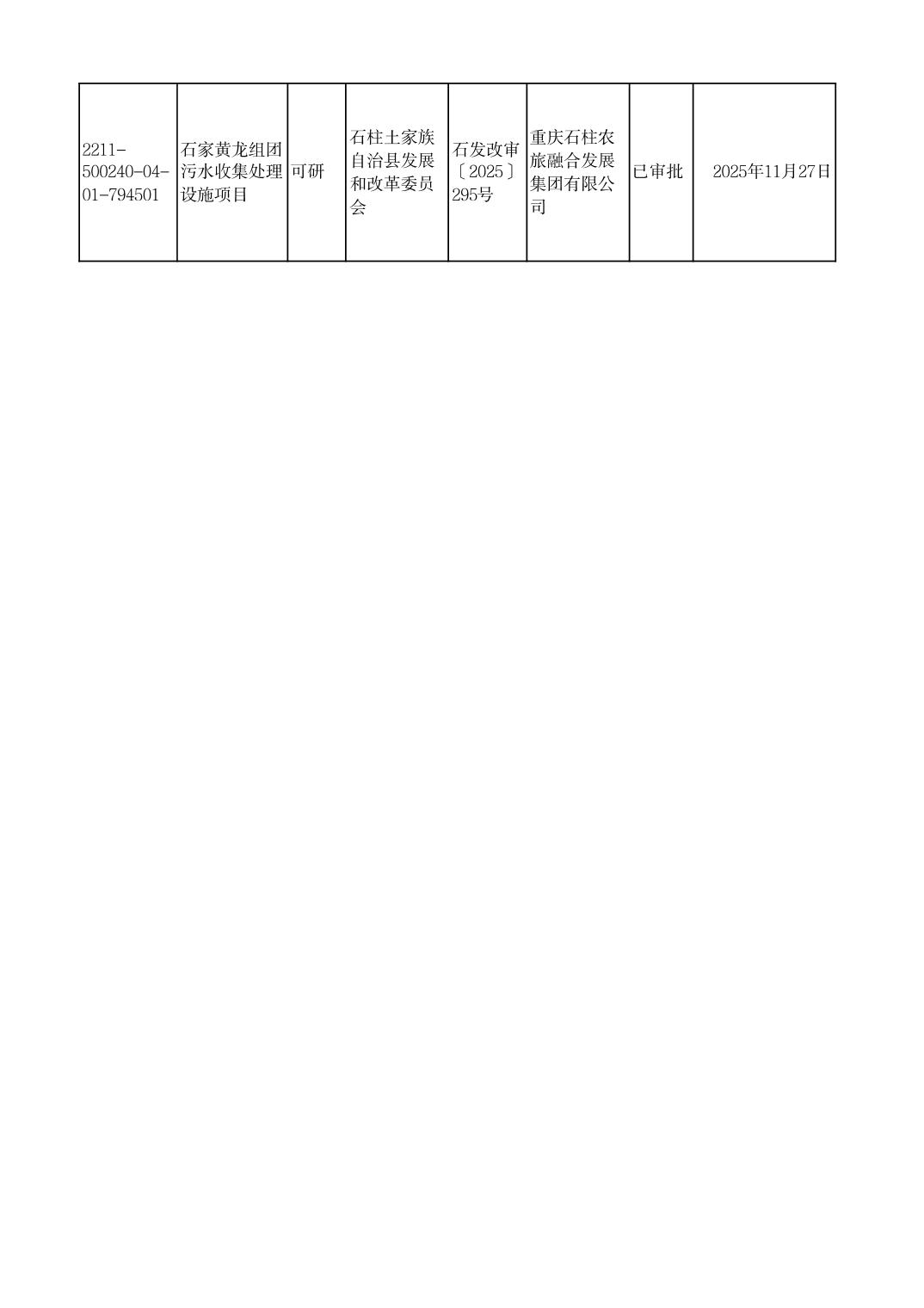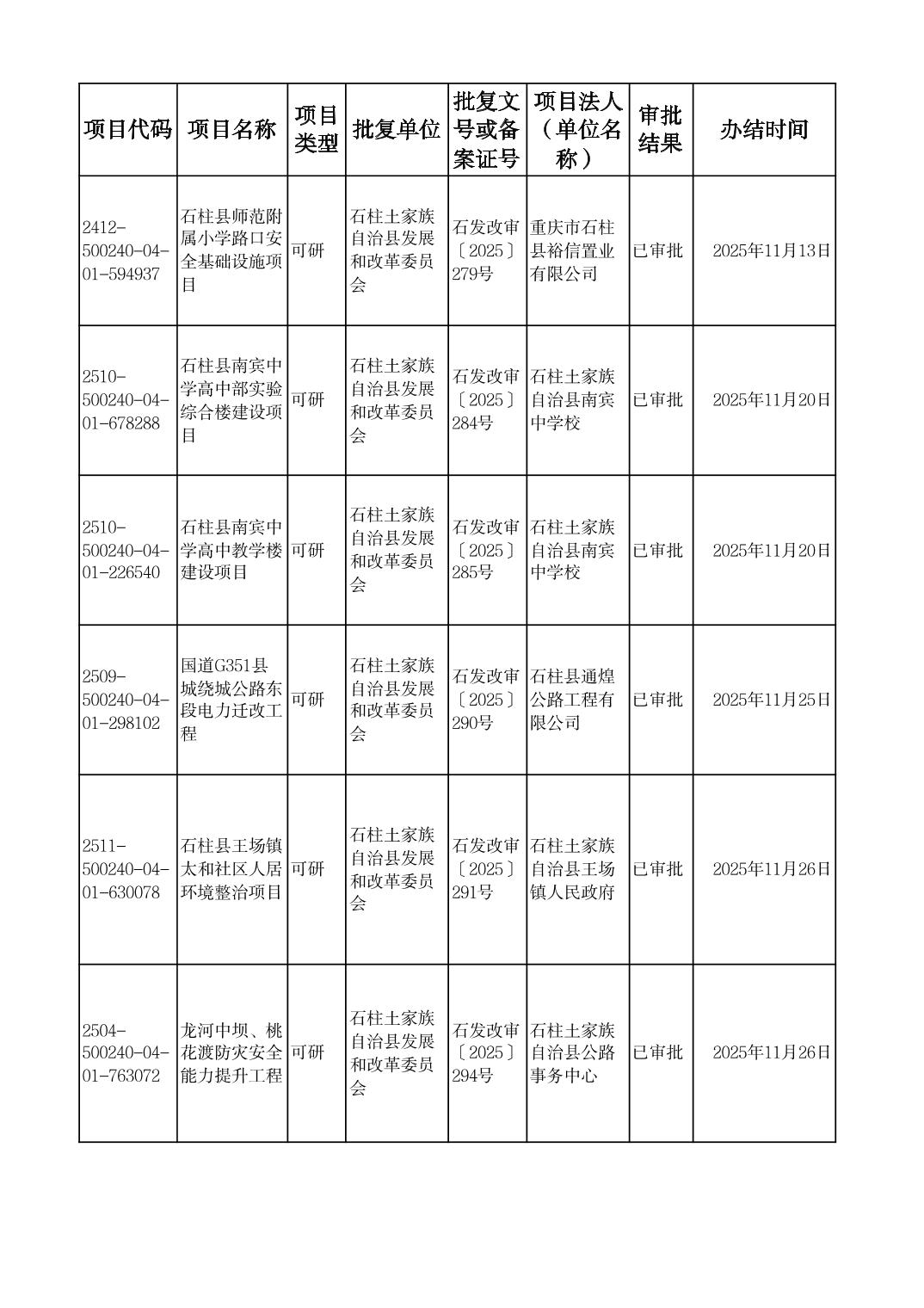 石柱县发展改革委2025年11月重大建设项目政府投资项目可行性研究报告审批表
