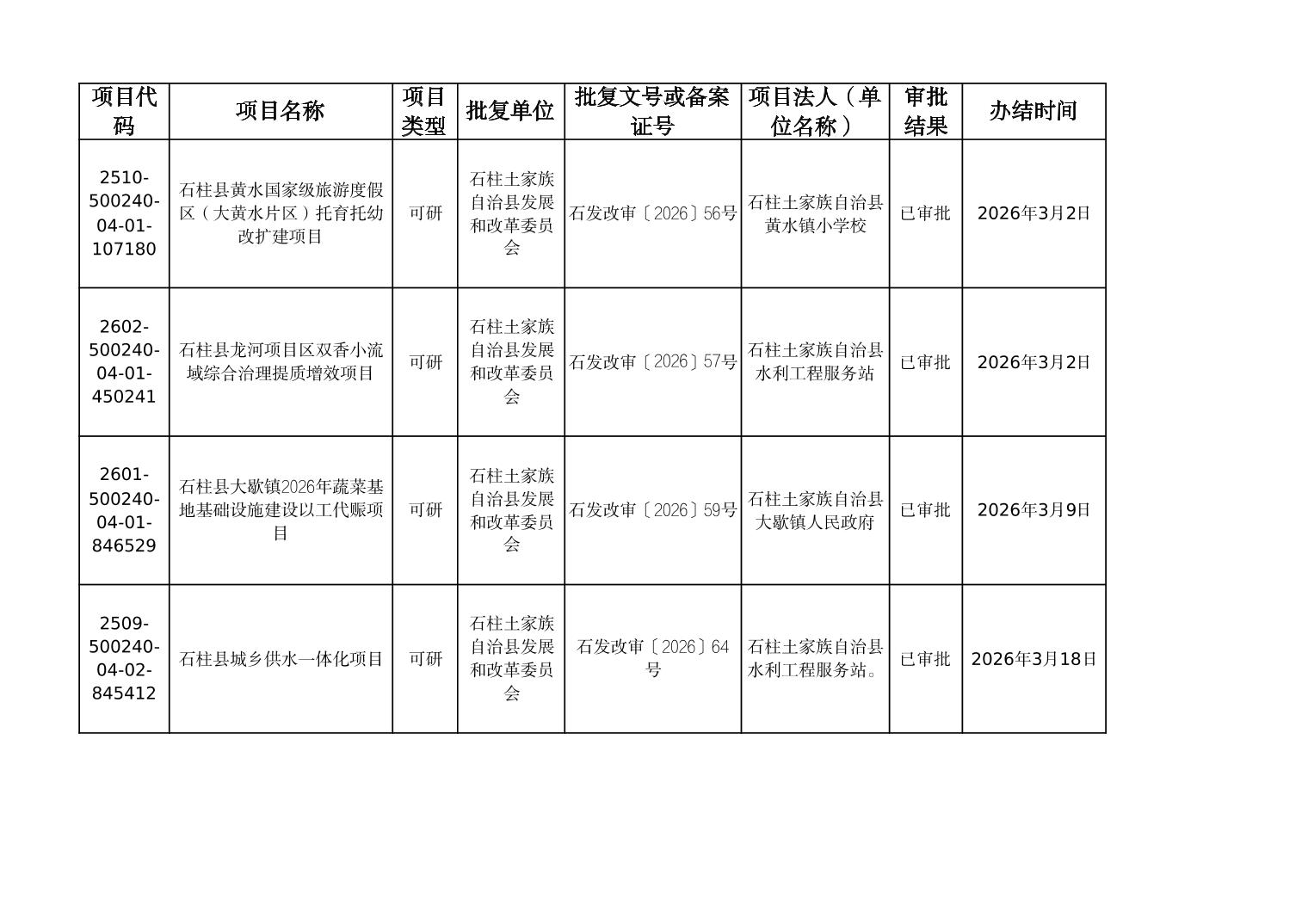 石柱县发展改革委2026年3月重大建设项目政府投资项目可行性研究报告审批表