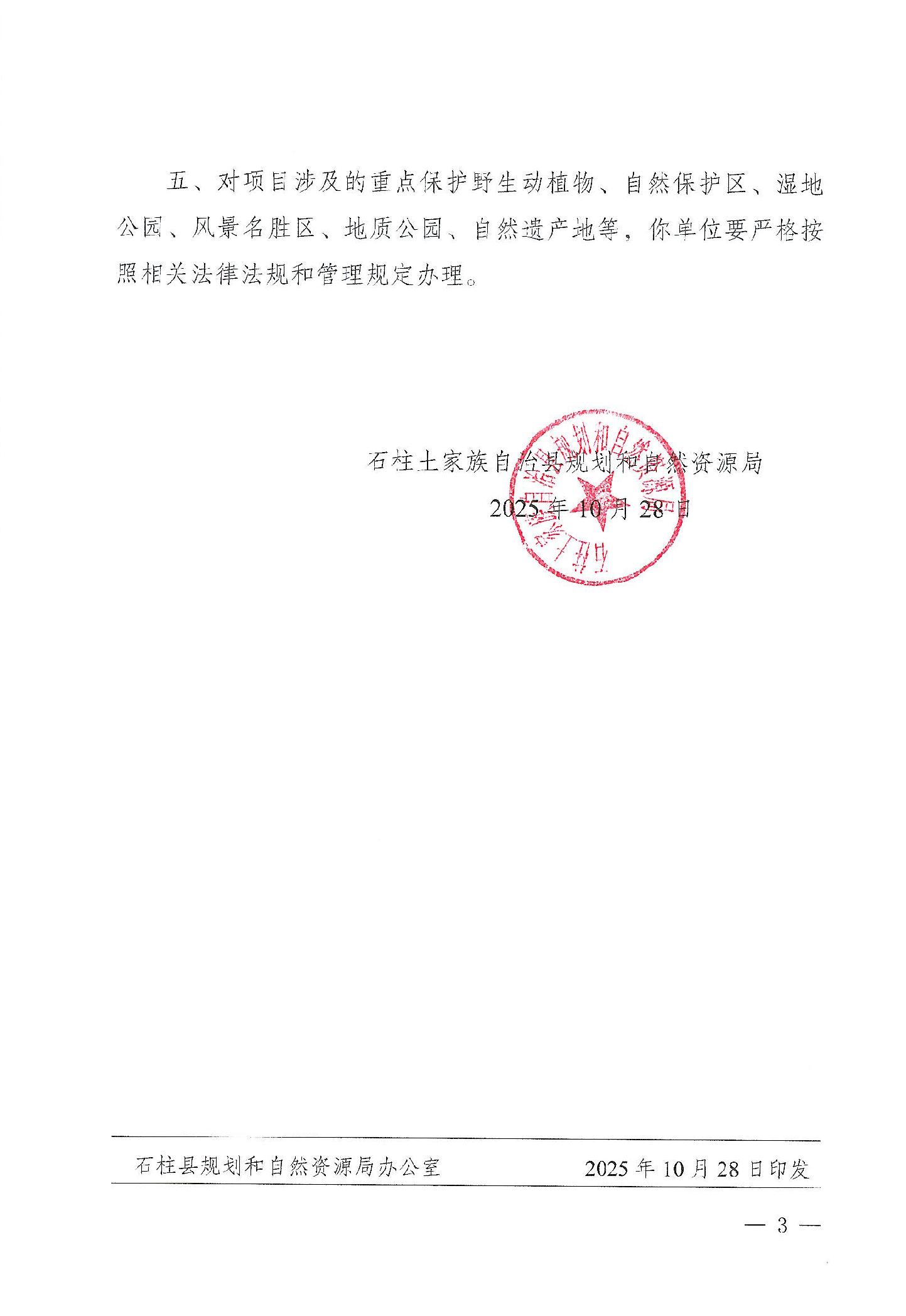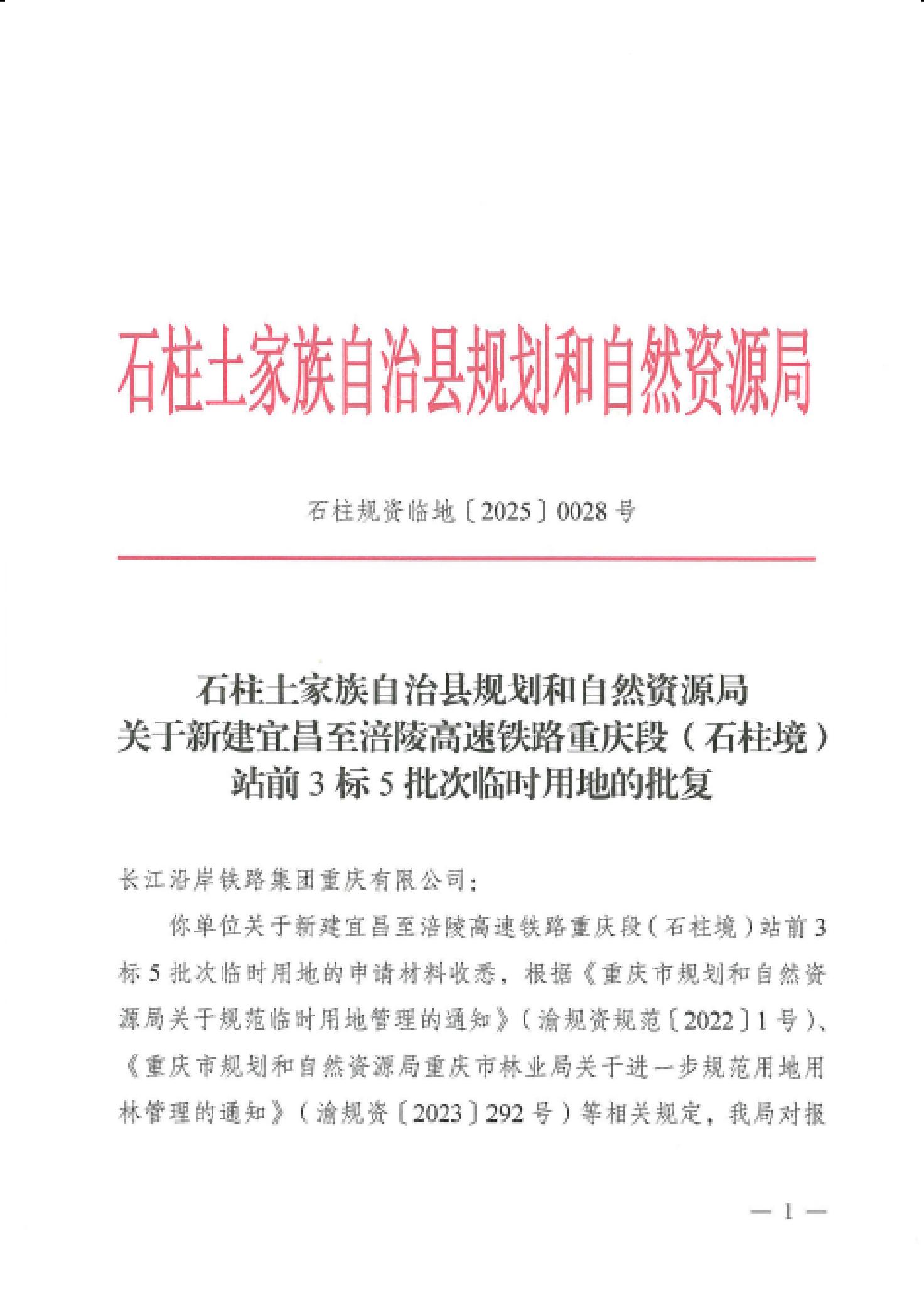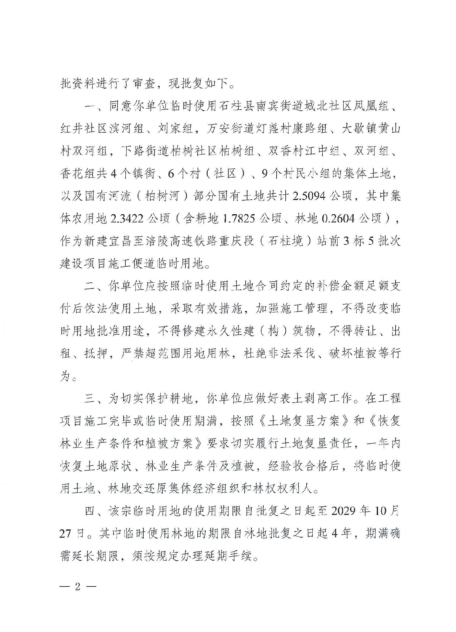 石柱土家族自治县规划和自然资源局 关于新建宜昌至涪陵高速铁路重庆段(石柱境)站前3标5批次临时用地的批复