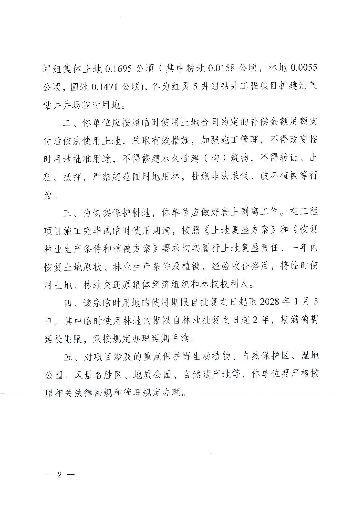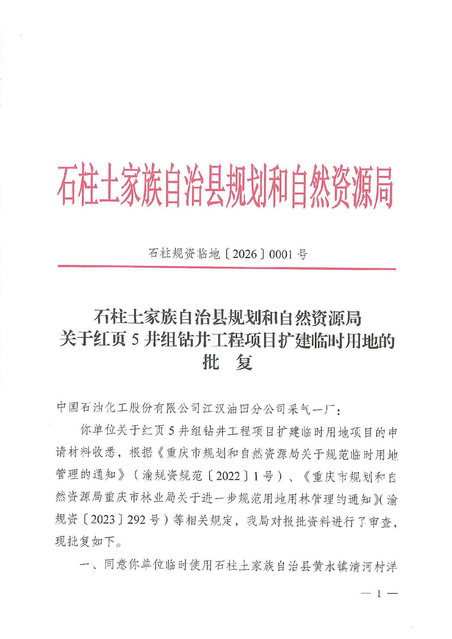 石柱土家族自治县规划和自然资源局 关于红页5井组钻井工程项目扩建临时用地的批复