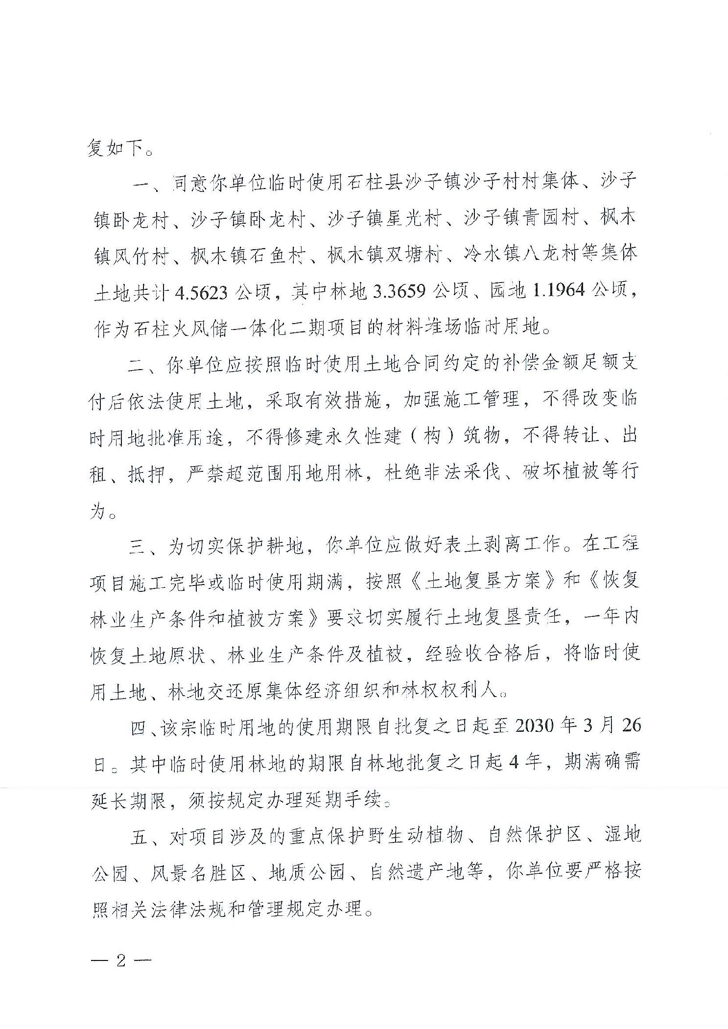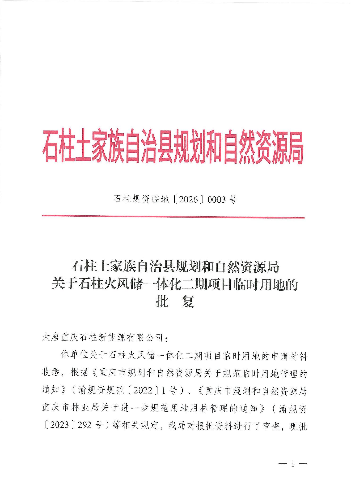 石柱土家族自治县规划和自然资源局 关于石柱火风储一体化二期项目临时用地的批复