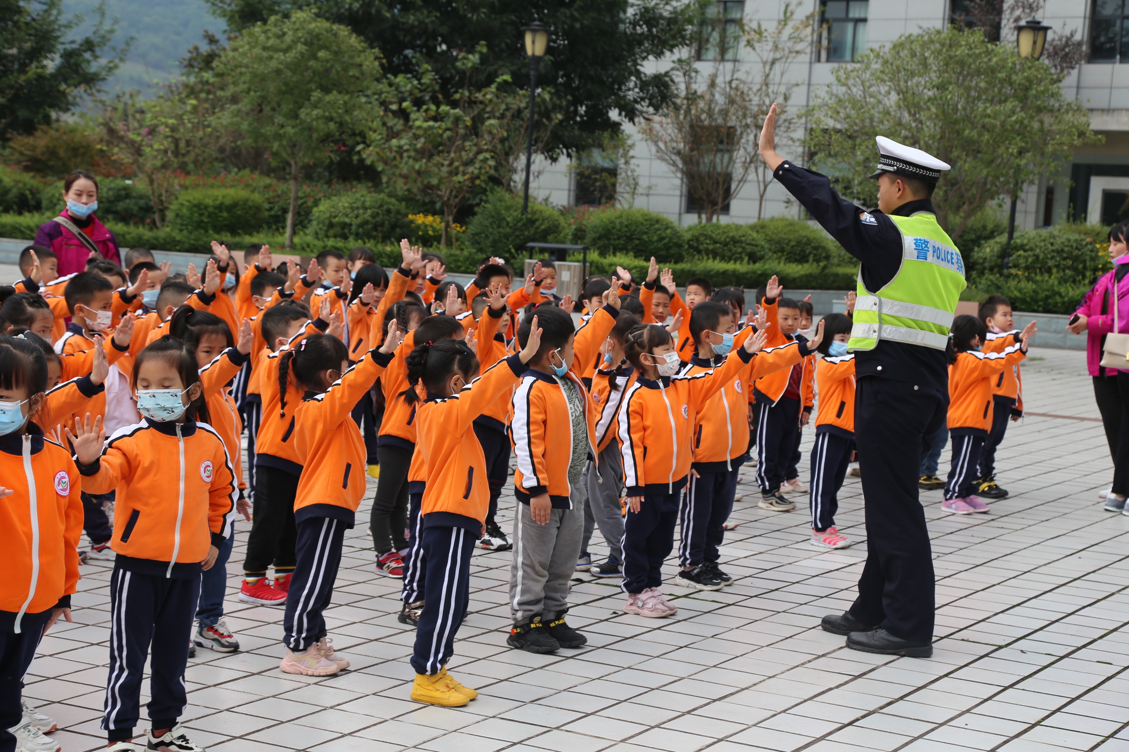 图为孩子们正在县公安局学习交通指挥手势