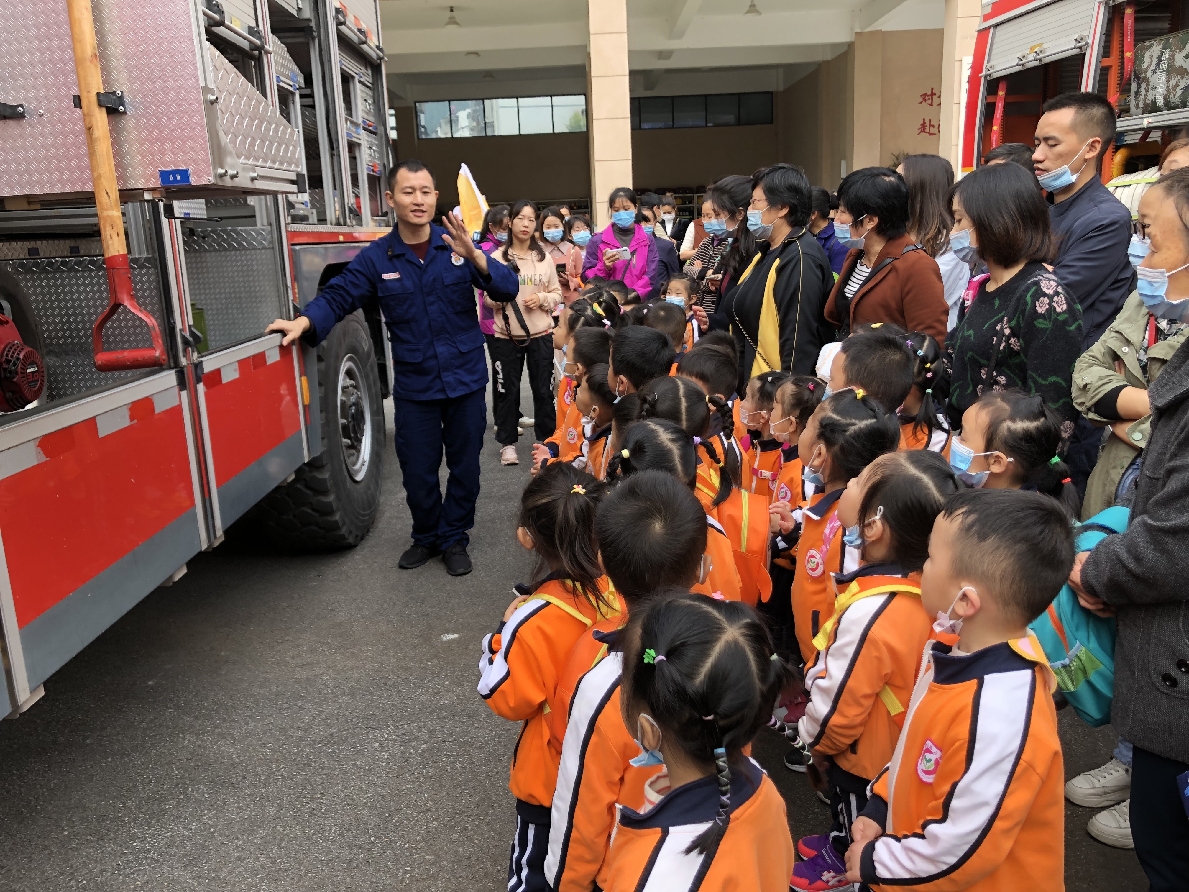 图为幼儿们正在县消防大队体验,了解消防车。