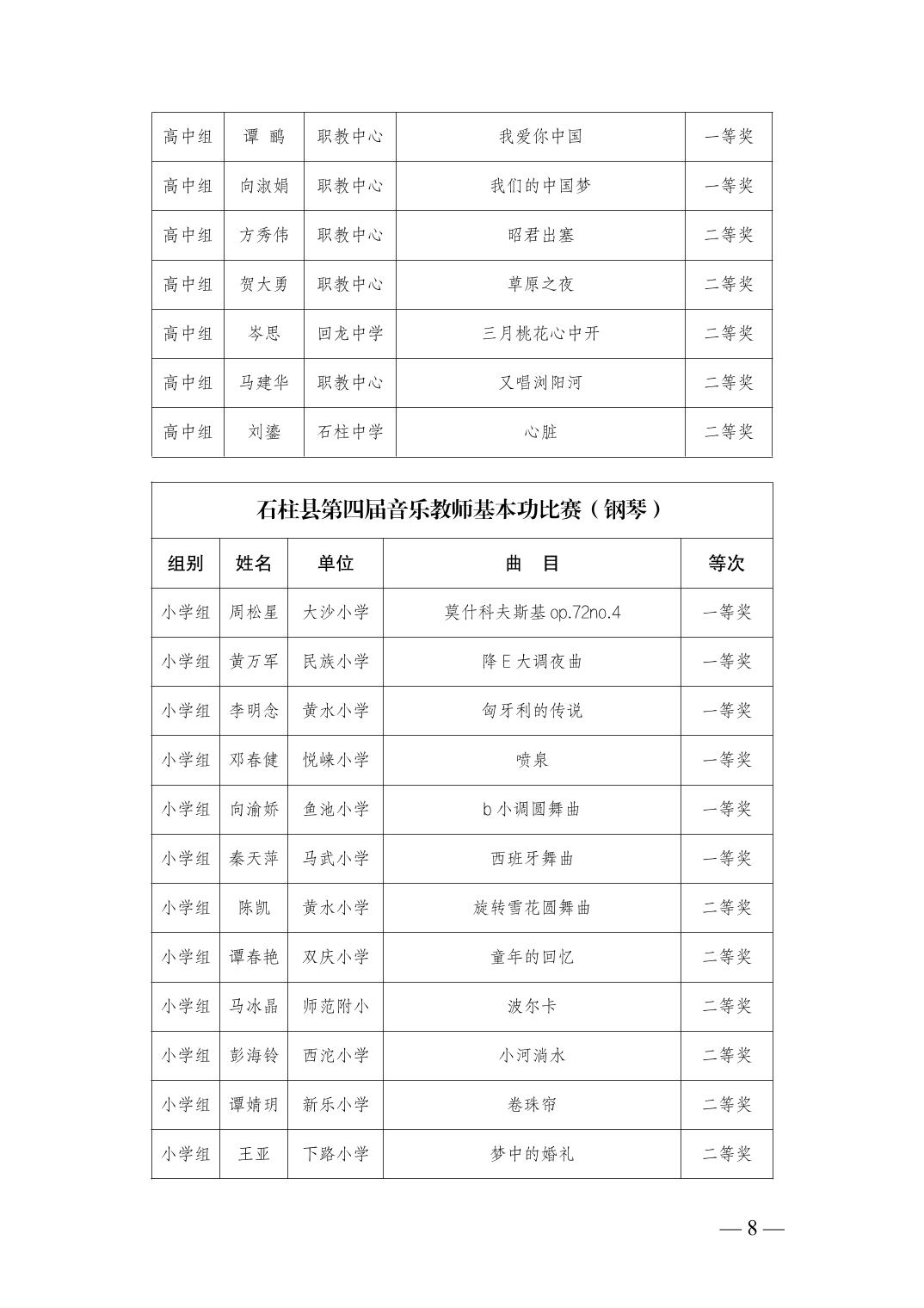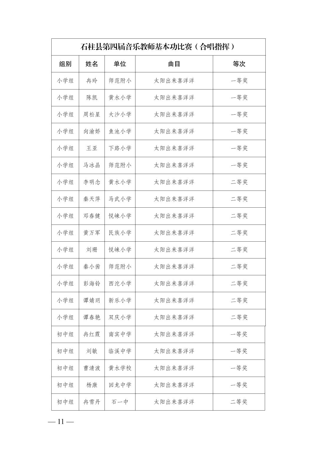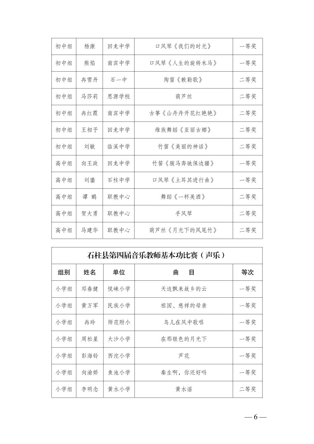 石柱土家族自治县教育委员会关于石柱县第四届中小学音乐教师基本功比赛获奖情况的通报