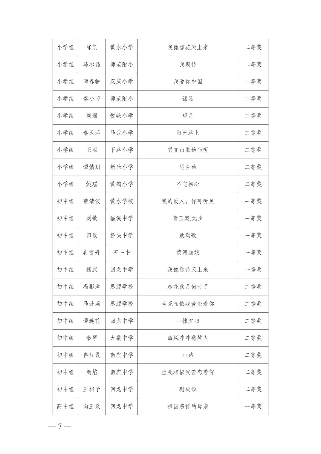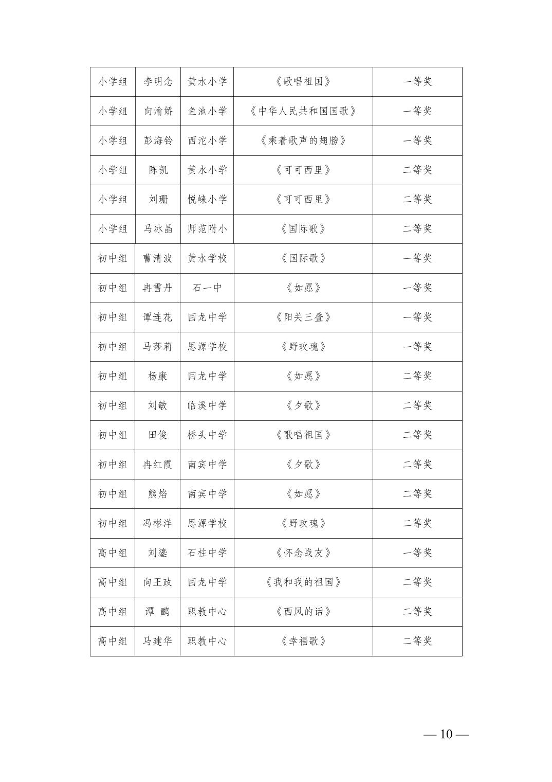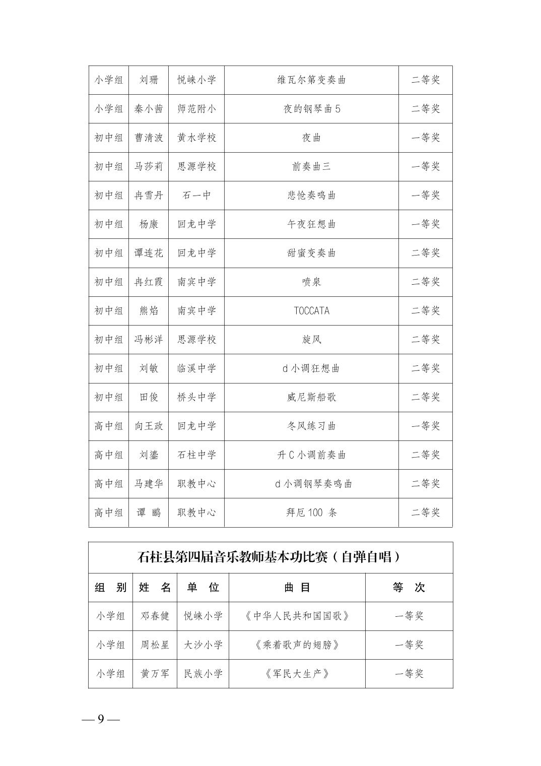 石柱土家族自治县教育委员会关于石柱县第四届中小学音乐教师基本功比赛获奖情况的通报