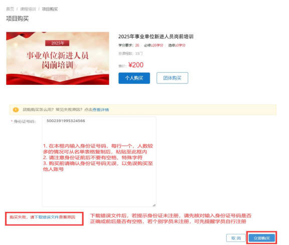 - 统一缴费。指定单位专人用个人账号登录学习平台,在项目购买页面,选择“团体购买”,输入需参训学员的身份证号码,输入完成后点击“立即购买”,等待系统验证,若学员账号存在且未购买对应学习计划,即可提交订单;购买成功,学员即可登录进行学习。如购买失败,可在页面左下角点击“下载错误文件”,查看原因后进行修改并重新提交订单。