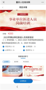 网络在线培训。学员登录重庆人社培训网www.cqrspx.cn,点击2025年事业单位新进人员岗前培训,进行注册、缴费、学习、考试、打印证书、发票申请等流程。(详见附件)若在此网站上已参加过其它学习项目,则用原账号进行登录。