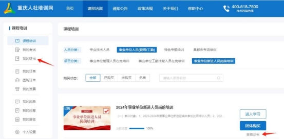 达到培训项目要求的学分后,返回课程培训页面,在导航栏选择“我的证书”,查看已完成的培训计划,点击按钮