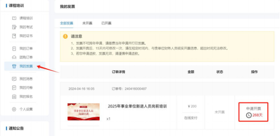 在左边导航栏选择“我的发票”,在已缴费的订单右侧“查看发票”,可打印或下载电子发票。若提交订单时选择“以后申请”,可在已缴费的订单右侧点击“申请开票”补开发票。