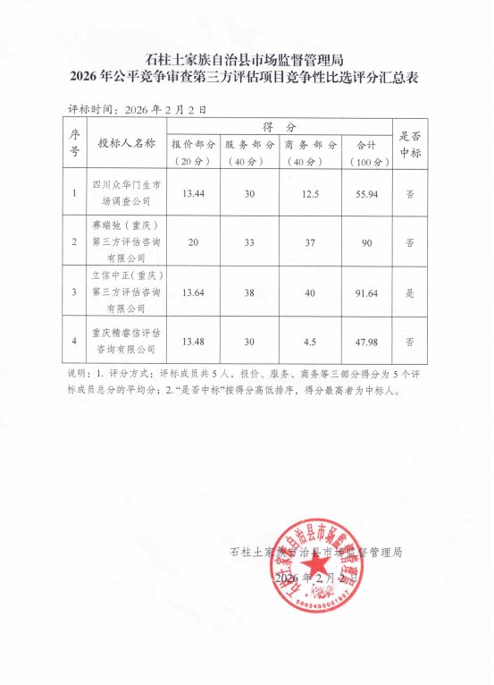 石柱县2026年公平竞争审查第三方评估项目竞争性比选评分汇总表及中标通知书