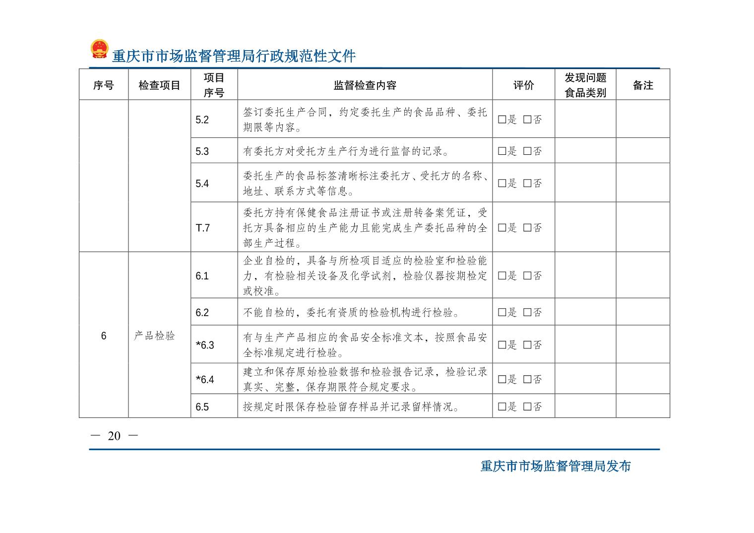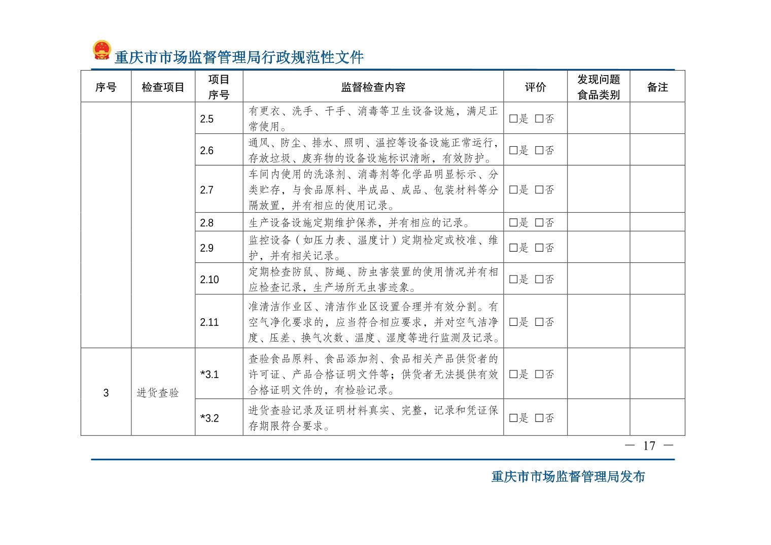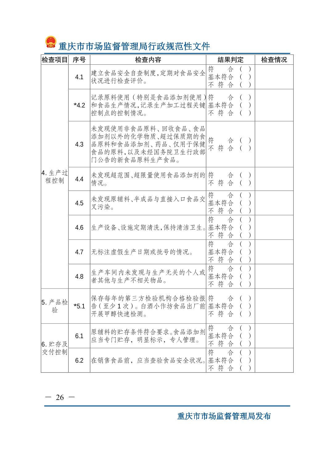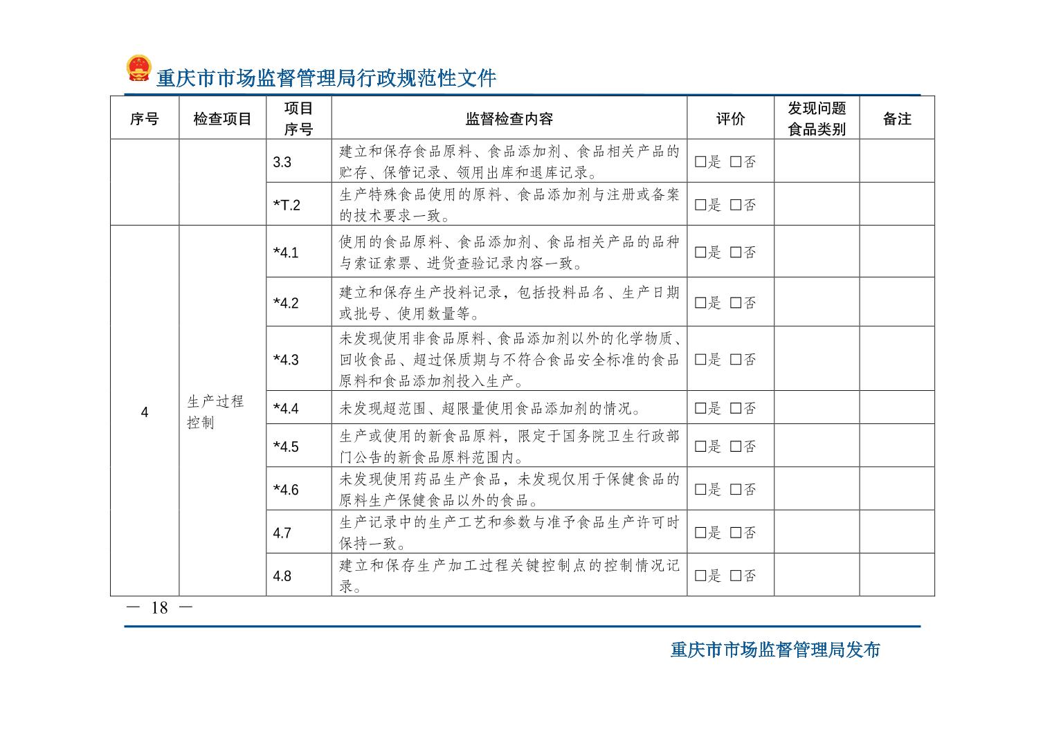 检查标准:重庆市市场监督管理局关于印发《食品生产监督检查管理办法(试行)》的通知