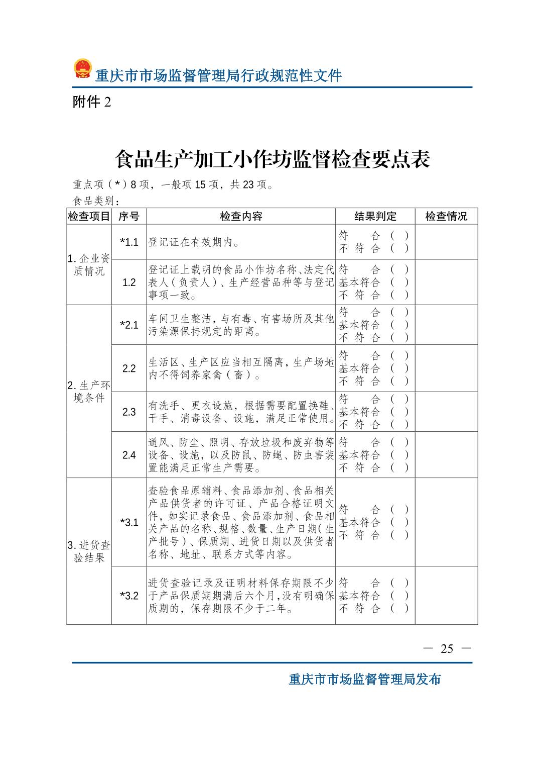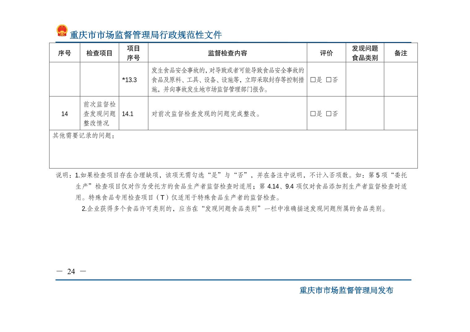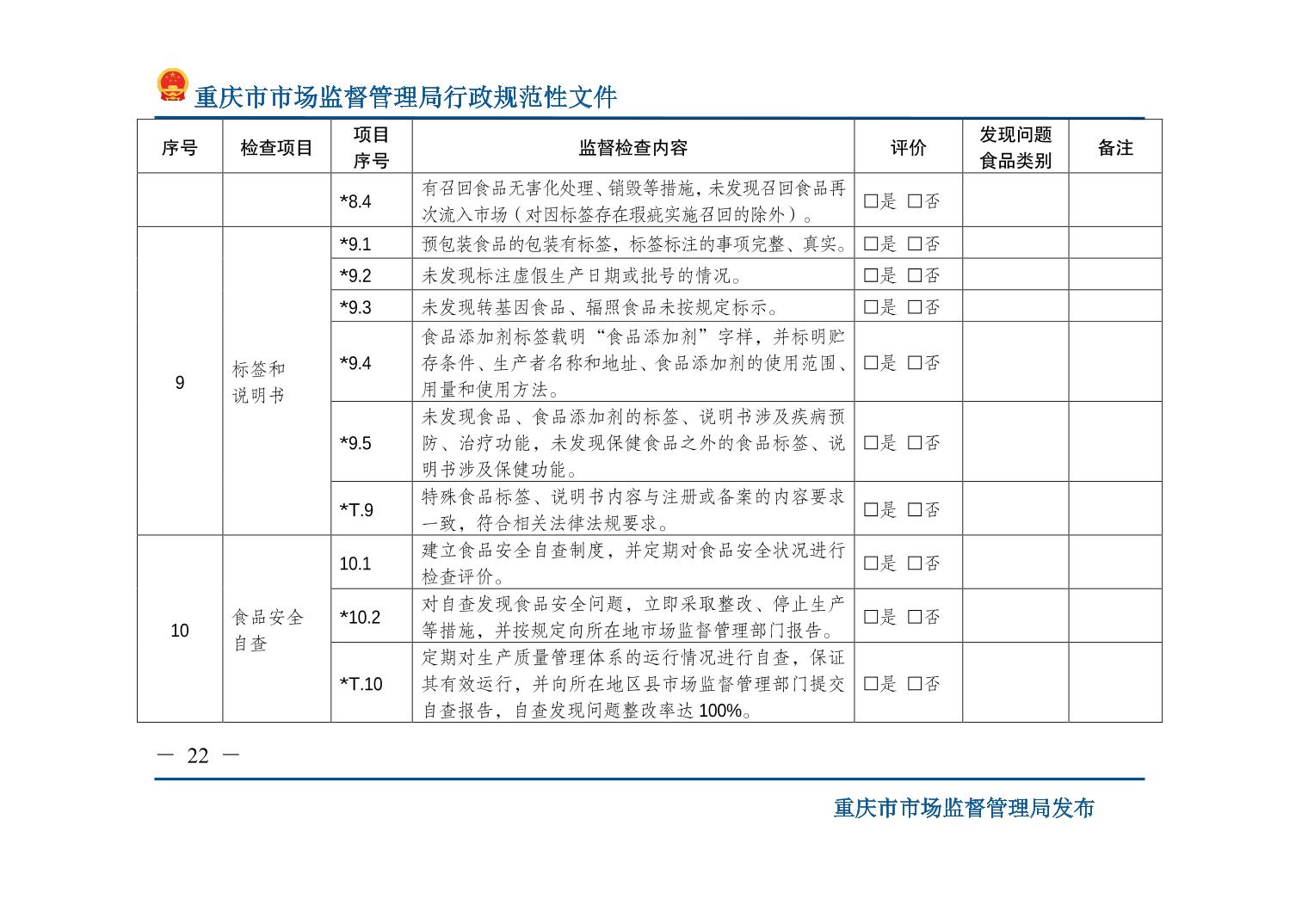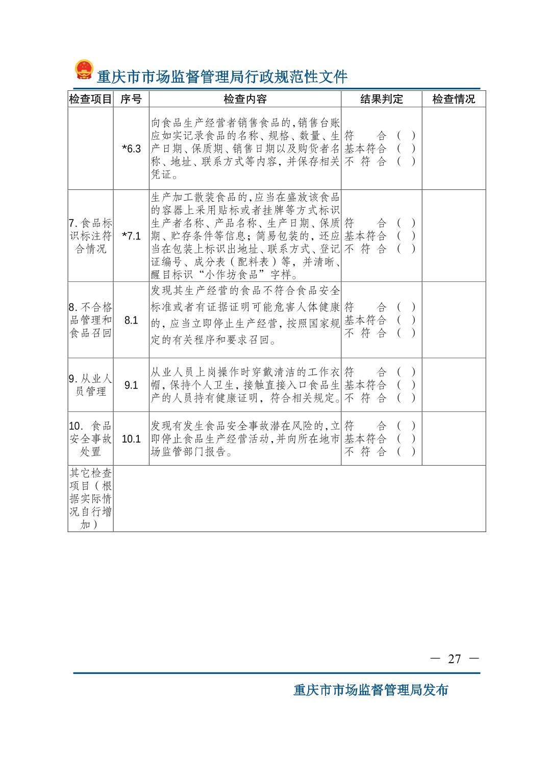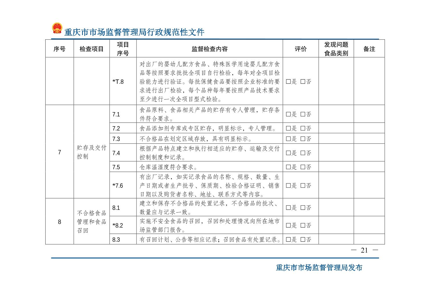 检查标准:重庆市市场监督管理局关于印发《食品生产监督检查管理办法(试行)》的通知
