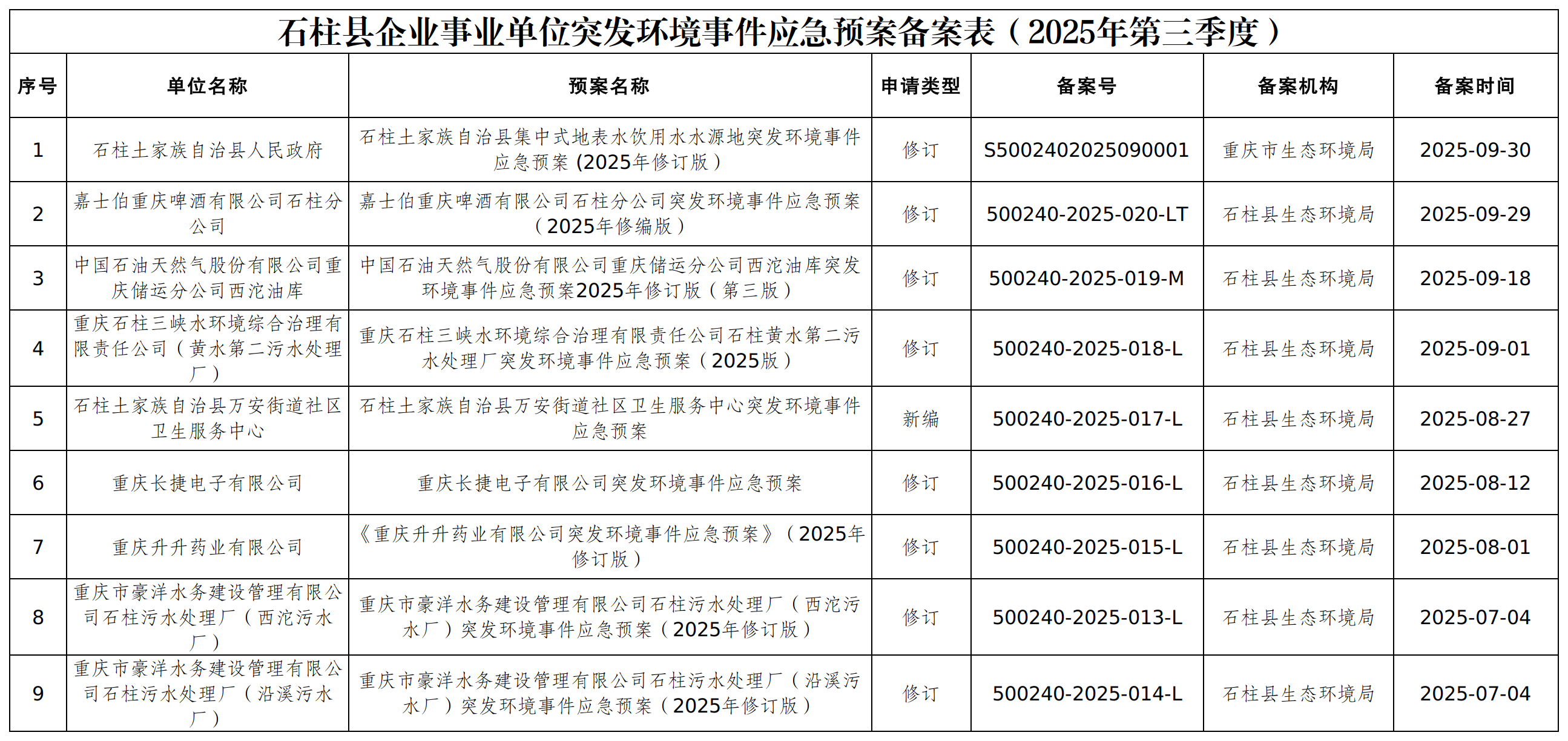 石柱县企业事业单位突发环境事件应急预案备案表(2025年第三季度)