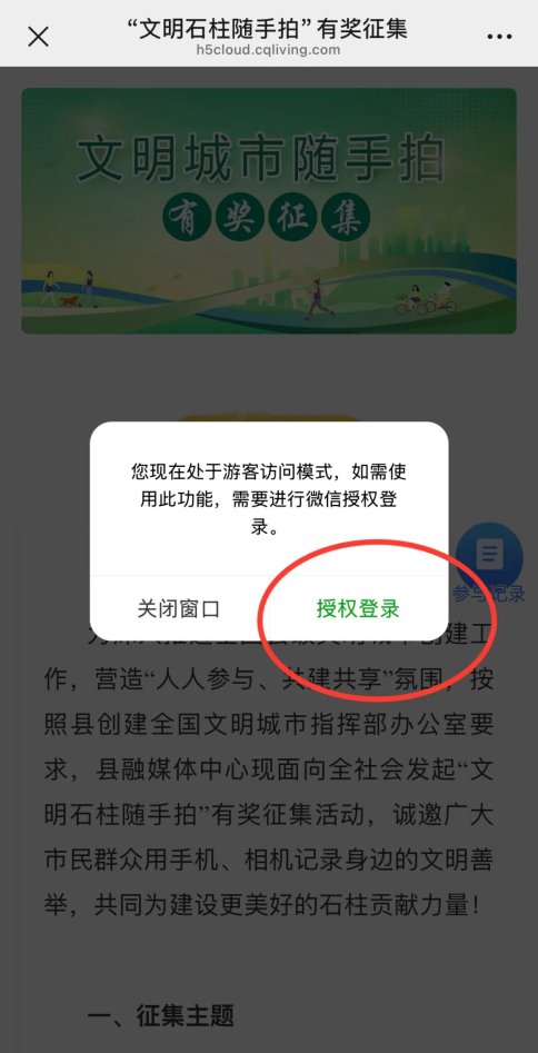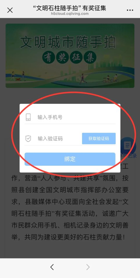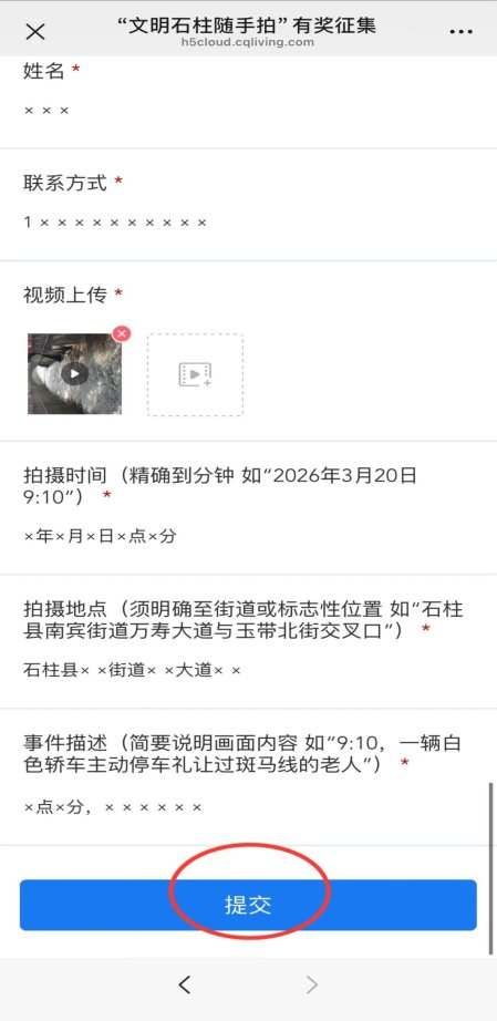 关注“石柱发布”微信公众号,点击菜单栏“有奖征集”进入投稿页面,点击“参与”→“授权登录”→输入“手机号和验证码”→填写“姓名、联系方式、视频上传、文字说明”等信息完成投稿。