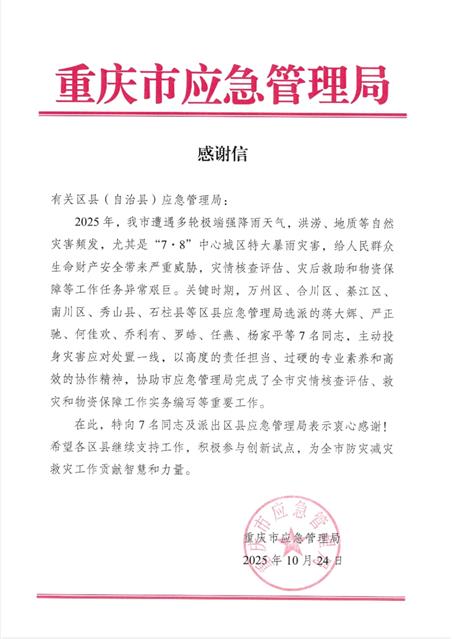 近日,重庆市应急管理局印发感谢信,对在2025年全市灾害应对处置工作中表现突出的先进个人予以表彰,我县应急管理局干部杨家平同志位列其中,其担当作为与专业素养获市级部门高度肯定。