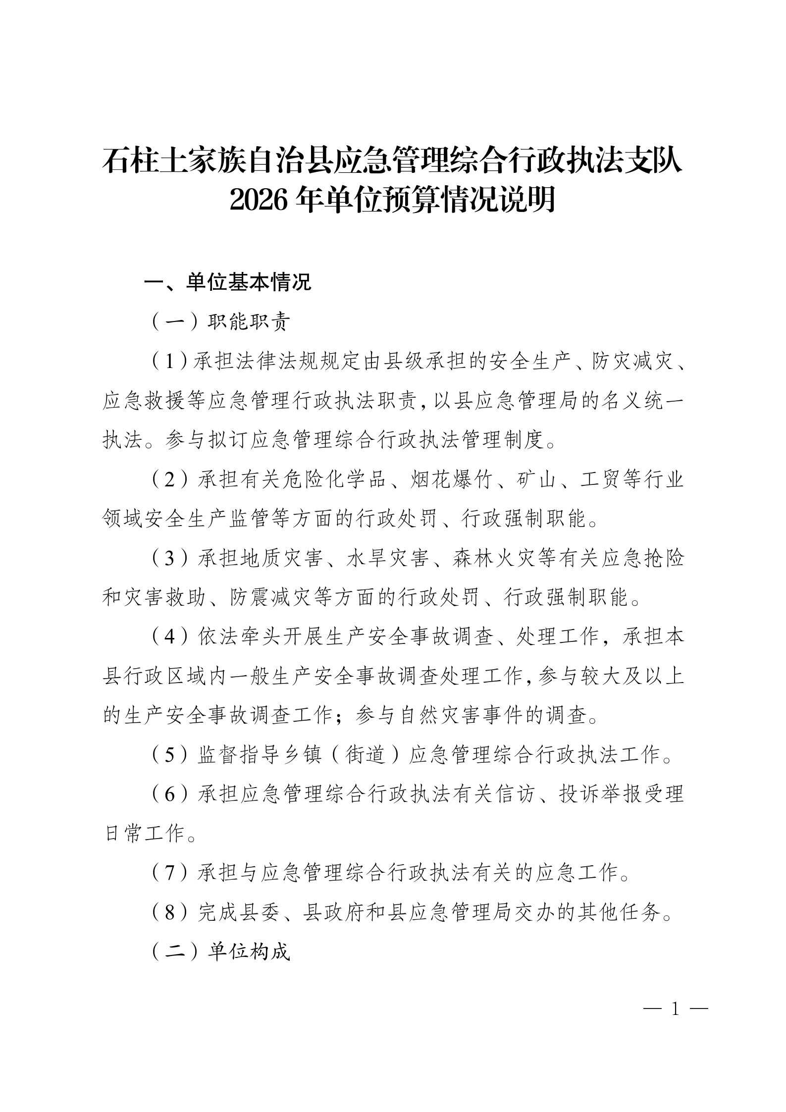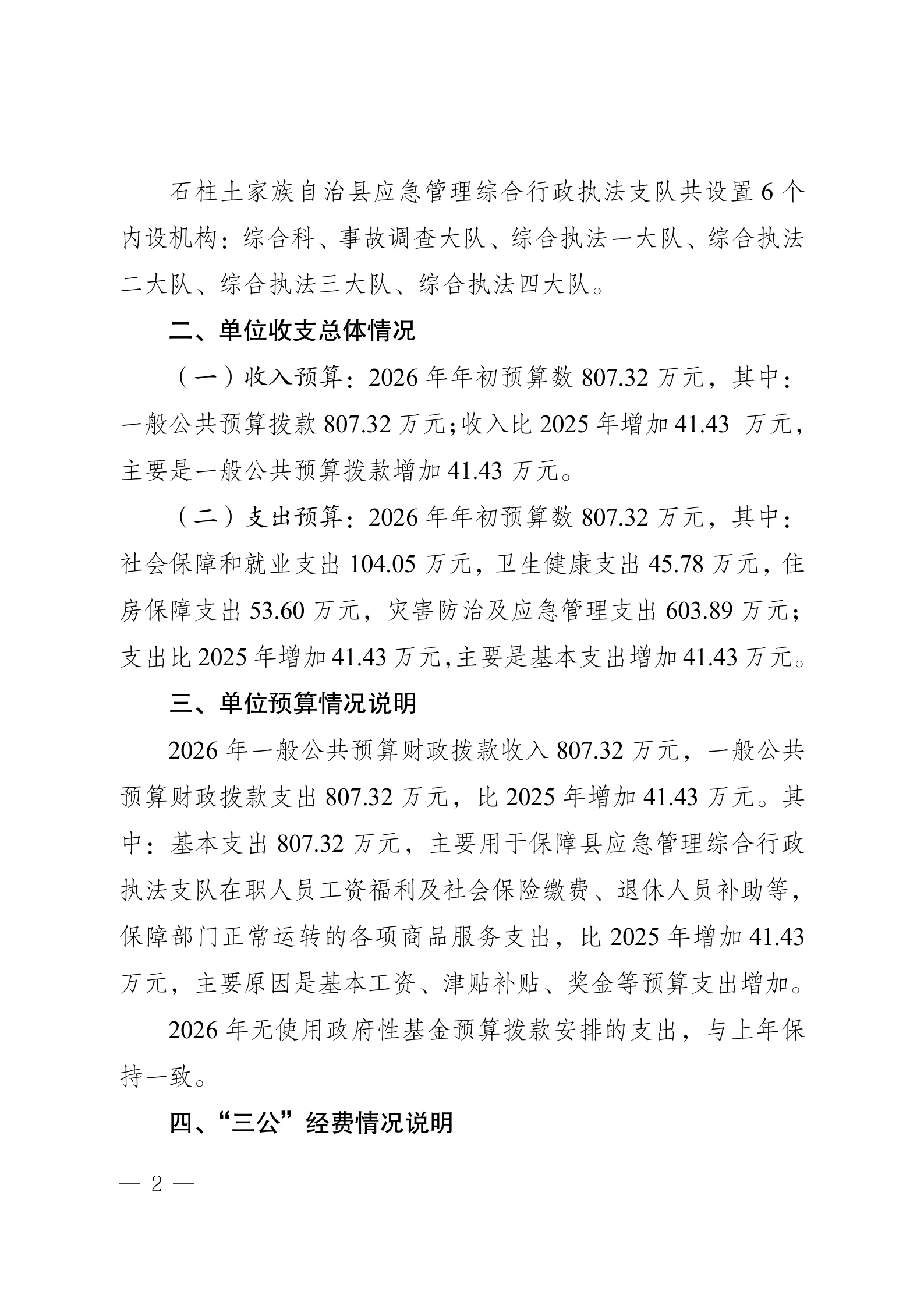 石柱土家族自治县应急管理综合行政执法支队 2026年单位预算情况说明