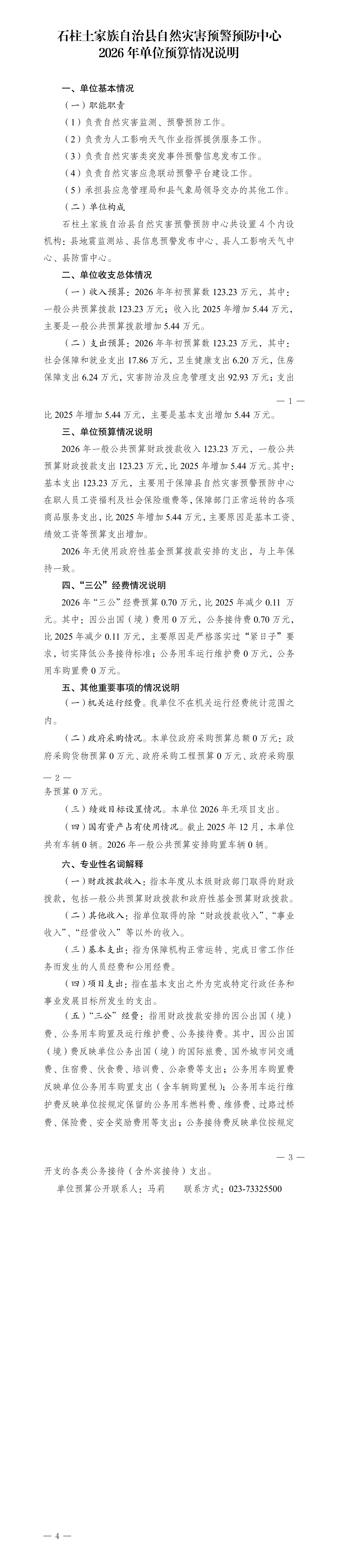 石柱土家族自治县自然灾害预警预防中心2026年单位预算情况说明