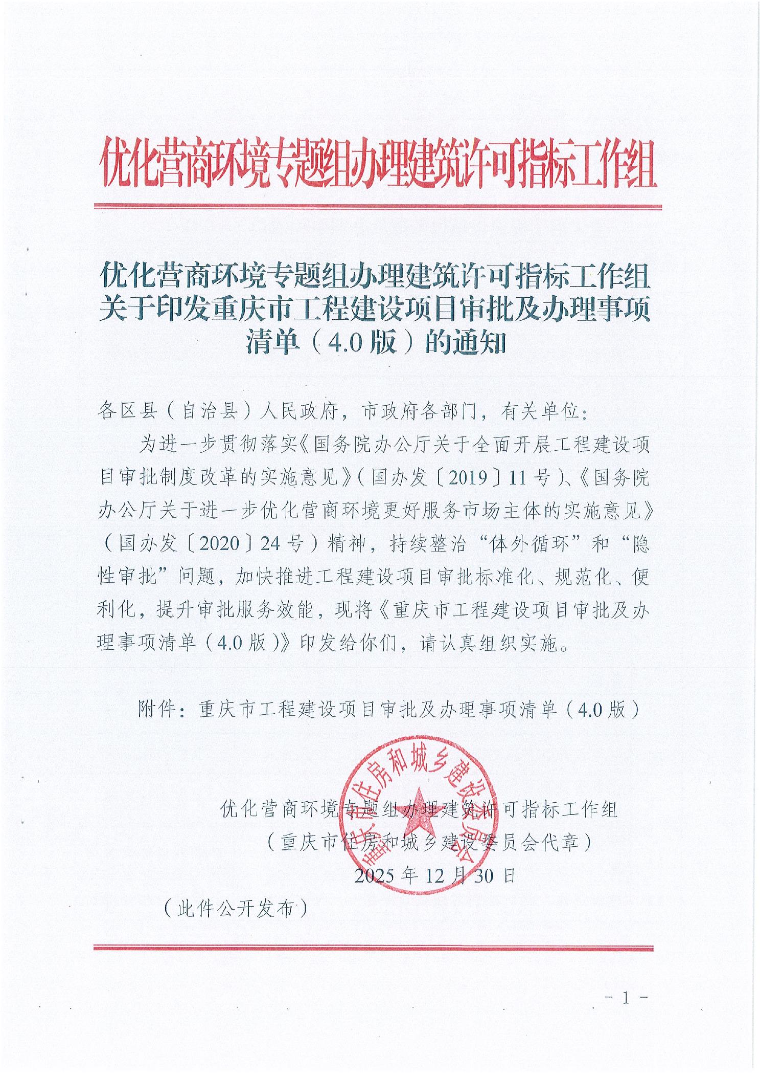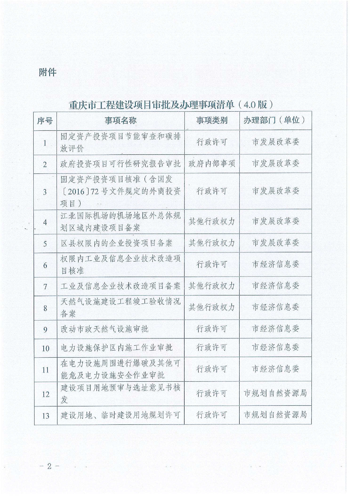 优化营商环境专题组办理建筑许可指标工作组关于印发重庆市工程建设项目审批及办理事项清单(4.0版)的通知