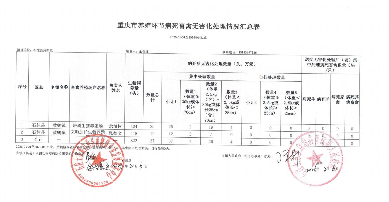 重庆市养殖环节病死畜禽无害化处理情况统计表(2026-1-1至2026-1-31止)