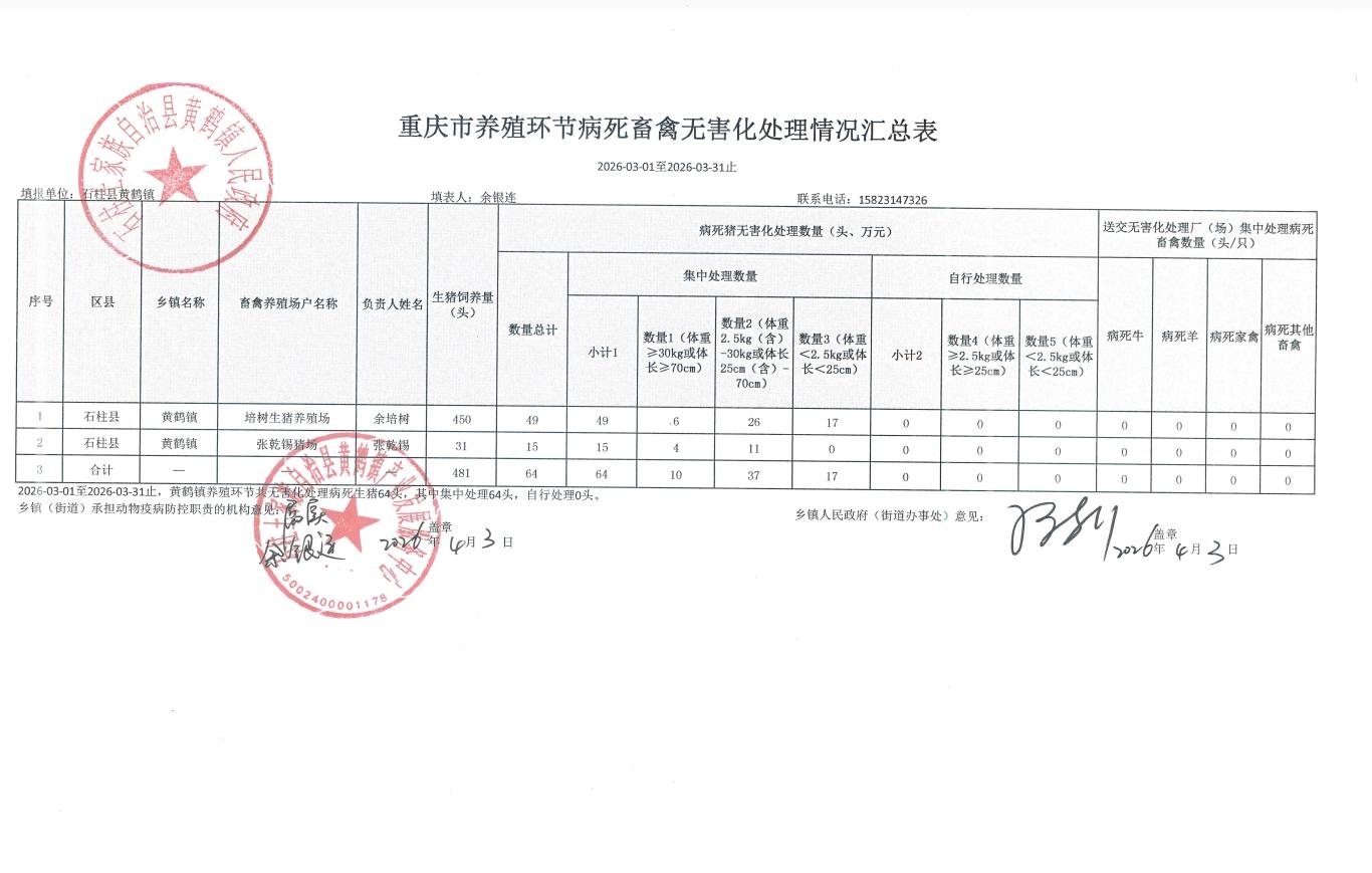 重庆市养殖环节病死畜禽无害化处理情况统计表(2026-3-1至2026-3-31止)