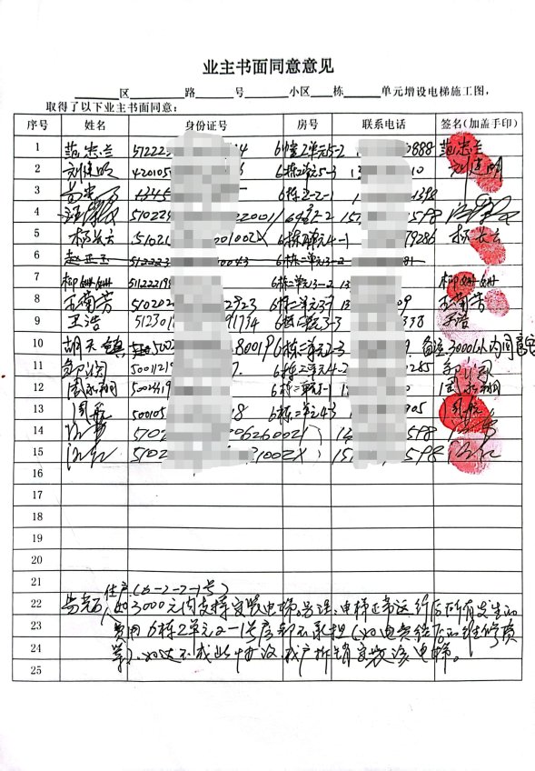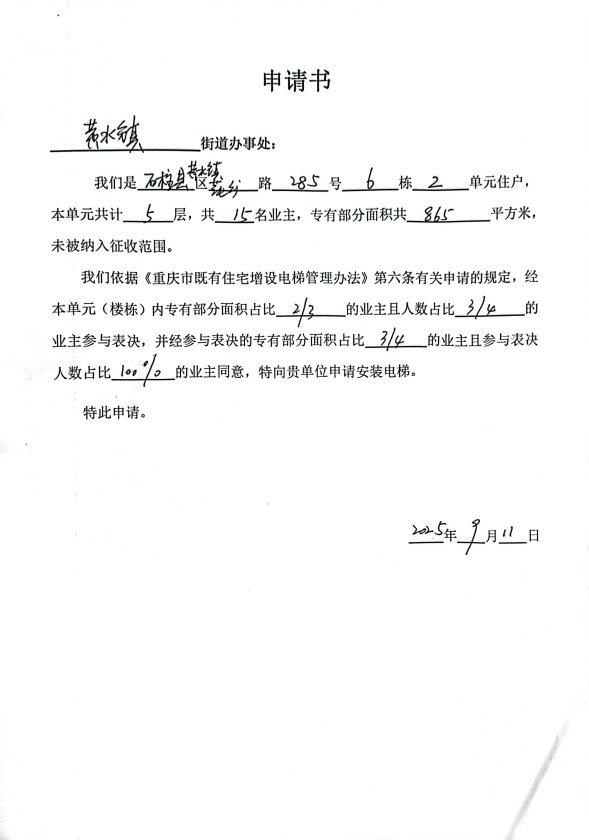 附件:书面申请、同意增设电梯的业主名单及书面同意意见、增设电梯示意图
