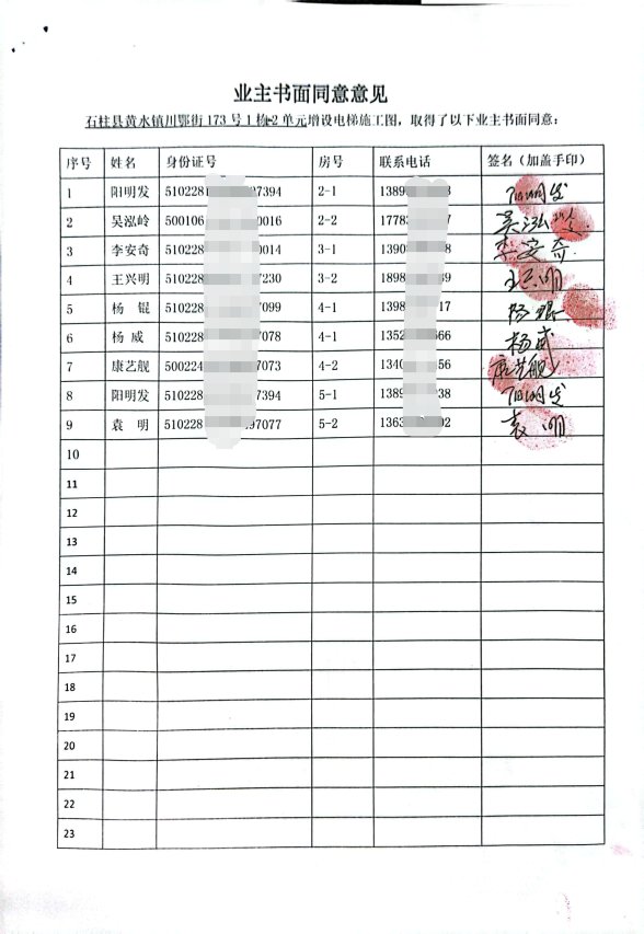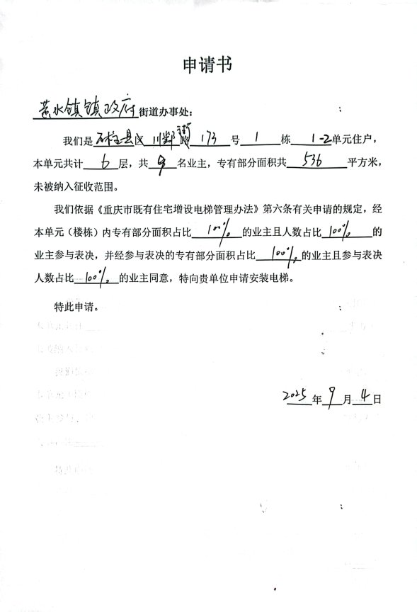 附件:书面申请、同意增设电梯的业主名单及书面同意意见、增设电梯示意图