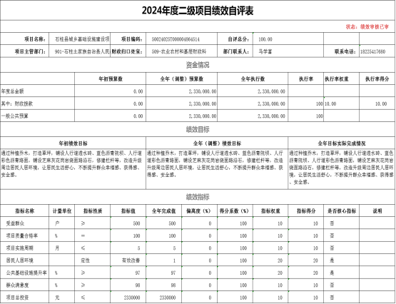 我单位对石柱县城乡基础设施建设项目(下路片区人居环境提升项目等7个项目)-桥北片区项目开展了绩效评价,涉及财政拨款项目资金233万元,评价得分100分,评价等次为优。