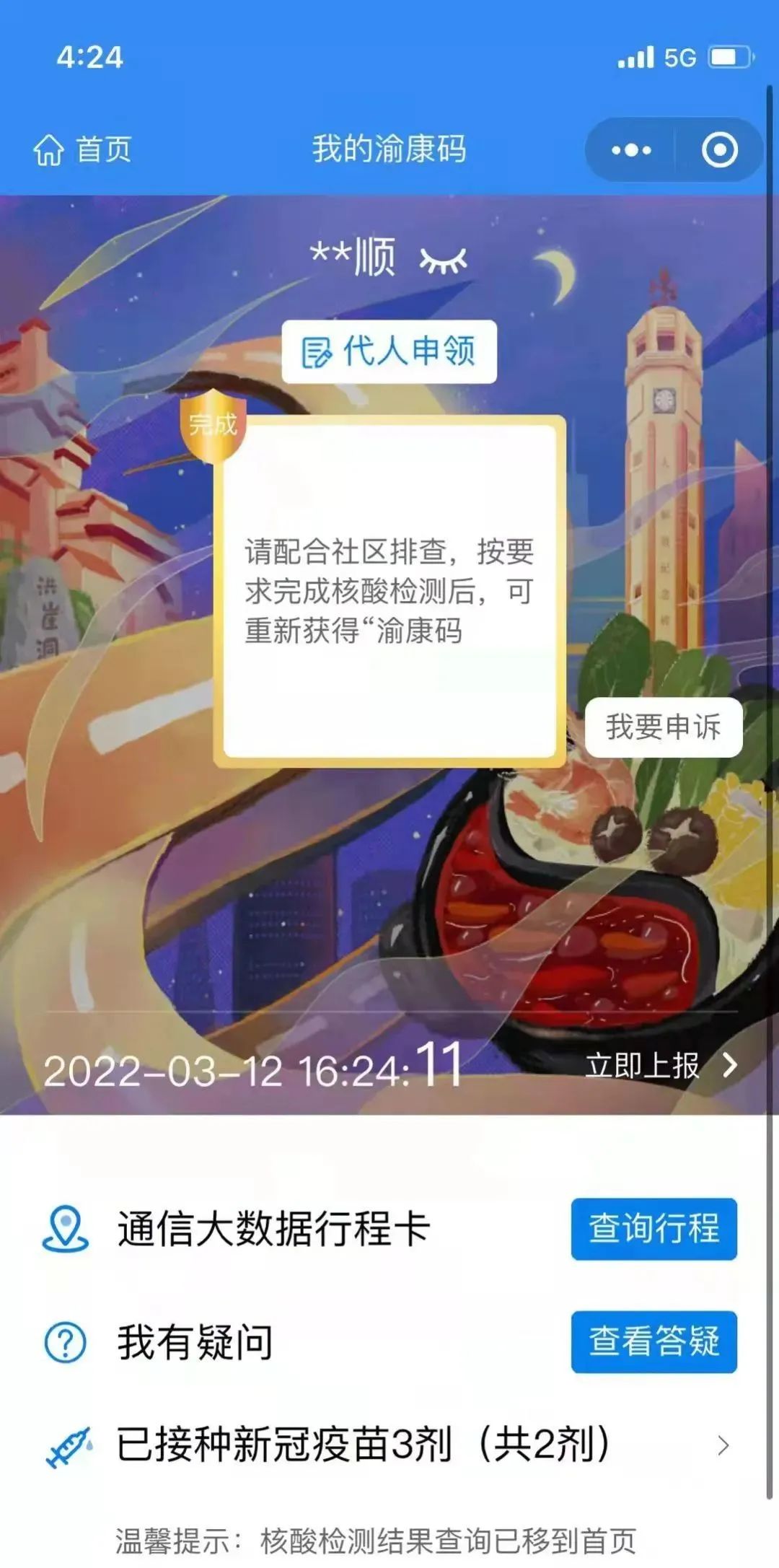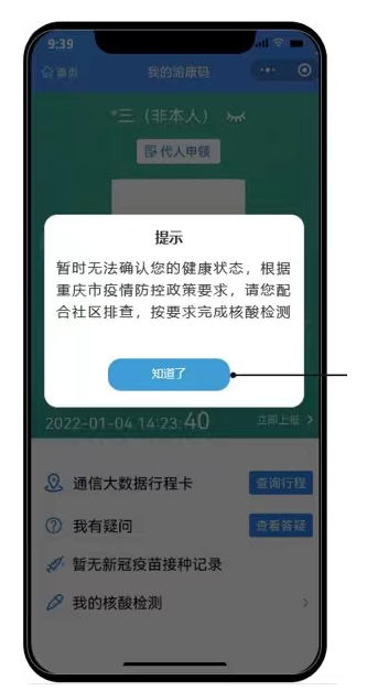 求,请您配合社区排查,按要求完成核酸检测后,可重新获得“渝康码”。