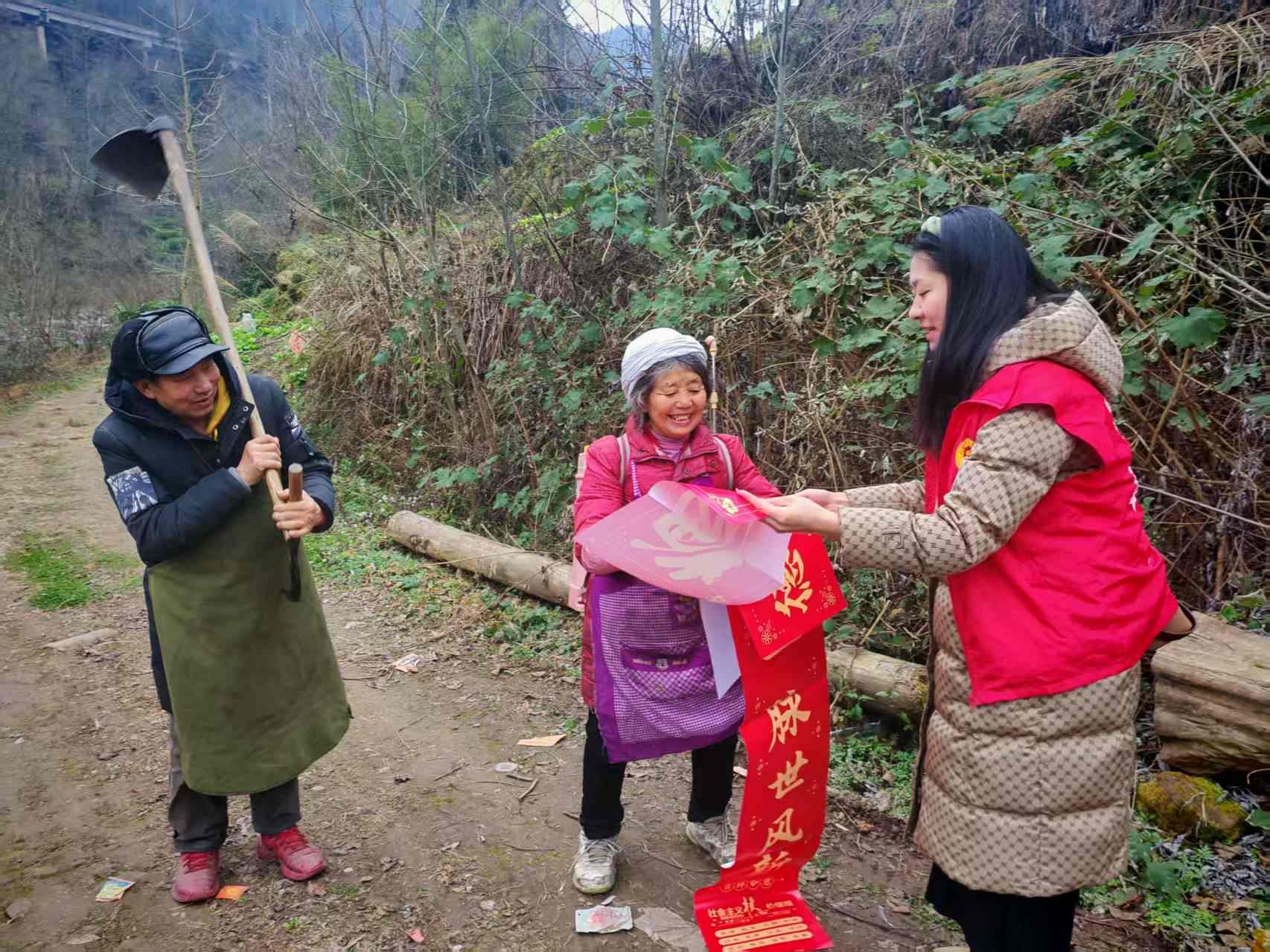 在田间地头、农家院落,志愿者们还主动为群众张贴“德润门楣”“文明一脉世风新”等主题春联,将文明新风、传统美德融入新春祝福,让文明之花绽放在乡村的每个角落。村民们脸上洋溢着幸福的笑容,纷纷表示感受到了党和政府的温暖,这个春节格外暖心。