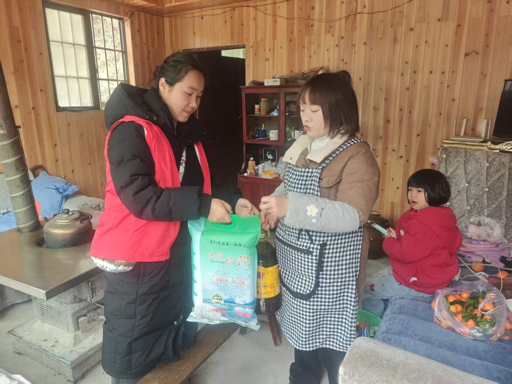 活动中,志愿者们身着红马甲,走村入户,为群众送上大米、食用油、春联、福字等新春慰问品。每到一户,都与群众亲切交谈,详细询问他们的身体状况、家庭生活及年货准备情况,倾听群众心声,了解实际需求,叮嘱大家注意冬季用火用电安全,提前送上节日的美好祝愿。