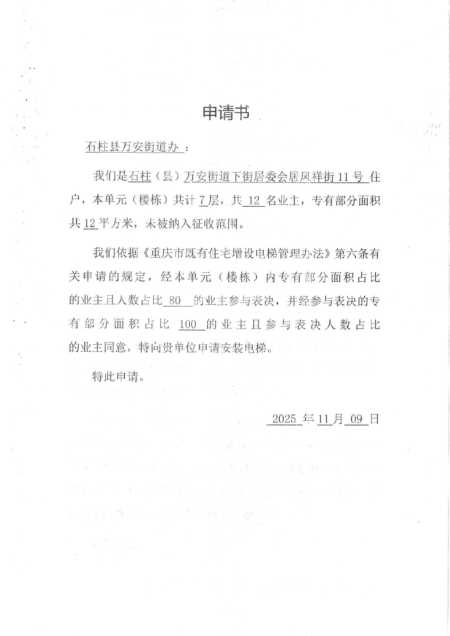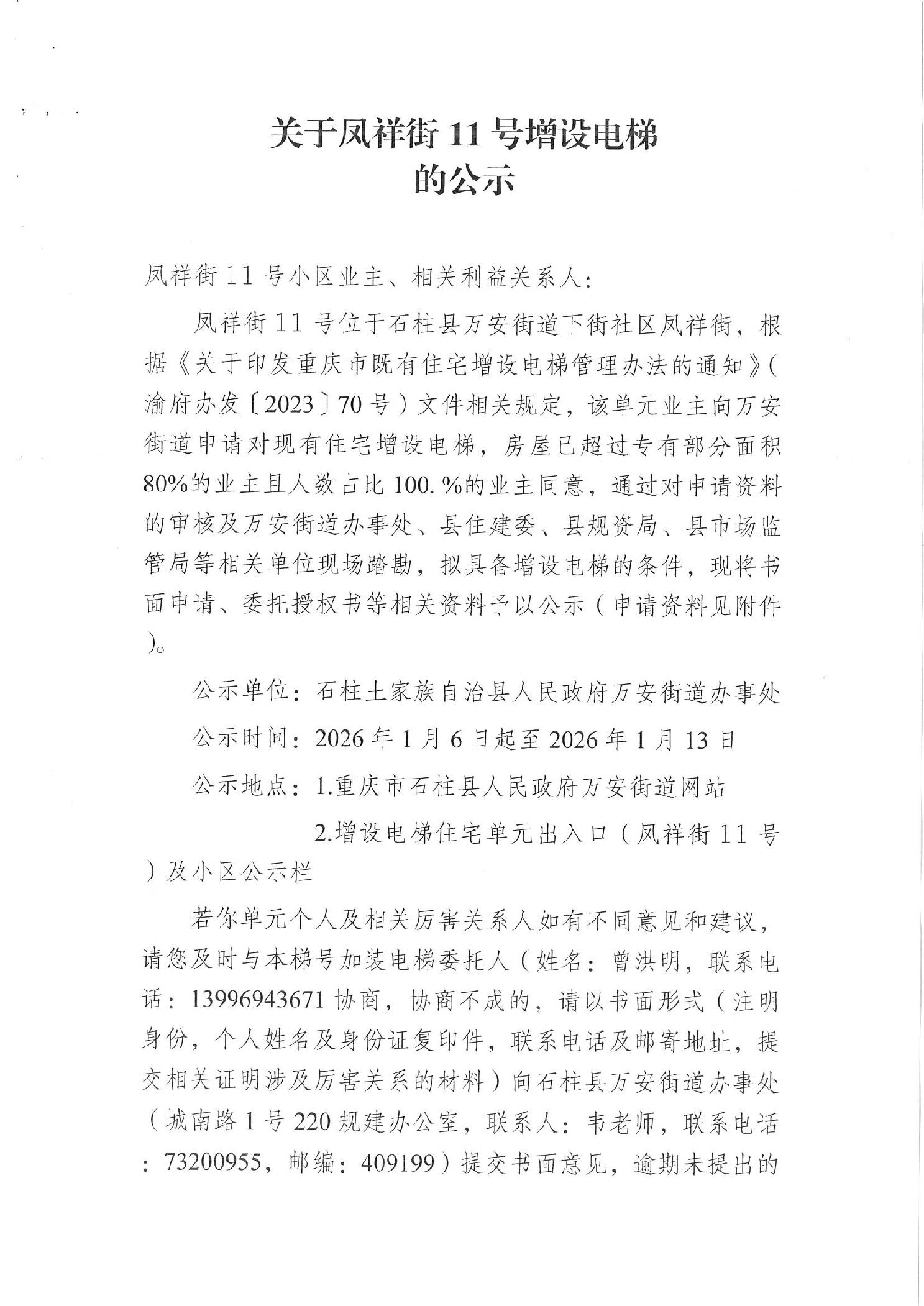 石柱土家族自治县人民政府万安街道办事处关于凤祥街11号增设电梯的公示