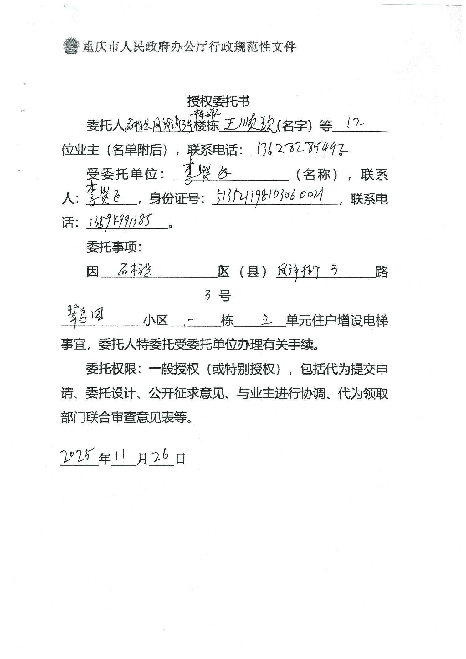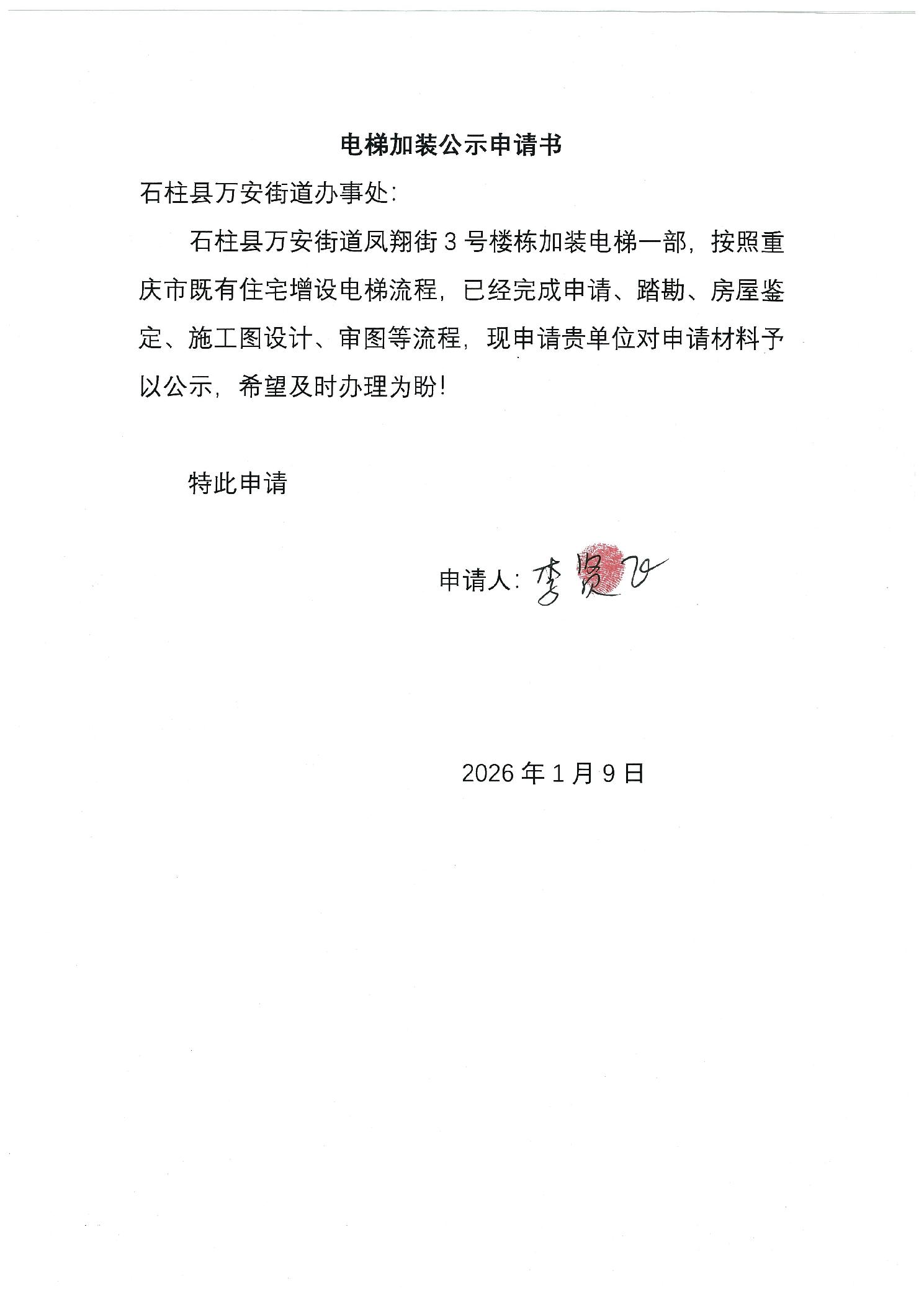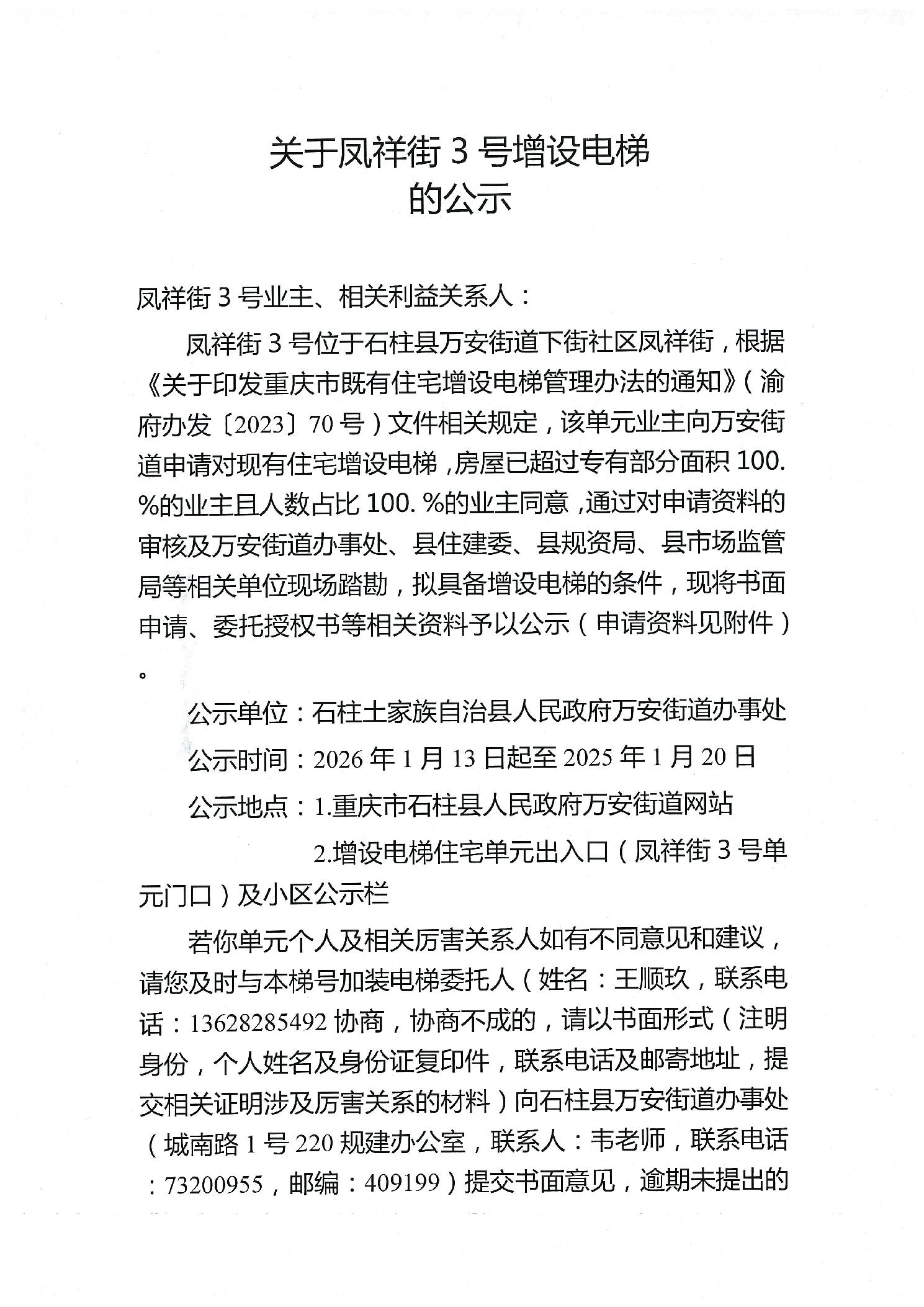凤祥街3号位于石柱县万安街道下街社区凤祥街,根据《关于印发重庆市既有住宅增设电梯管理办法的通知》(渝府办发〔2023〕70号)文件相关规定,该单元业主向万安街道申请对现有住宅增设电梯,房屋已超过专有部分面积100. %的业主且人数占比100. %的业主同意,通过对申请资料的审核及万安街道办事处、县住建委、县规资局、县市场监管局等相关单位现场踏勘,拟具备增设电梯的条件,现将书面申请、委托授权书等相关资料予以公示(申请资料见附件)。
