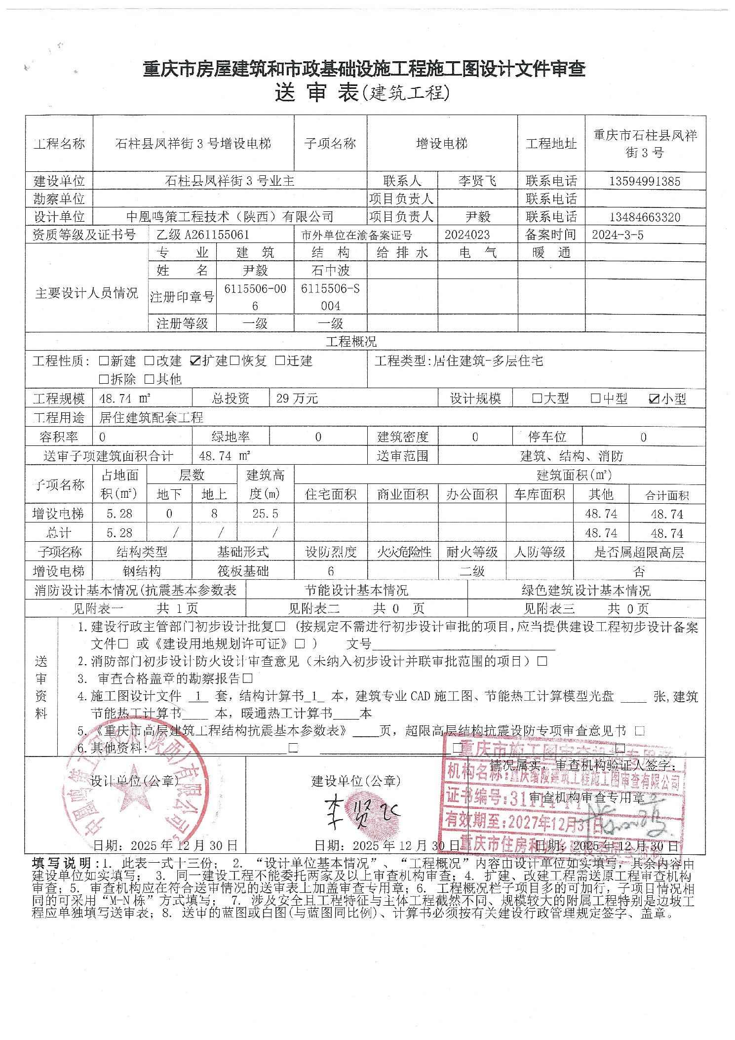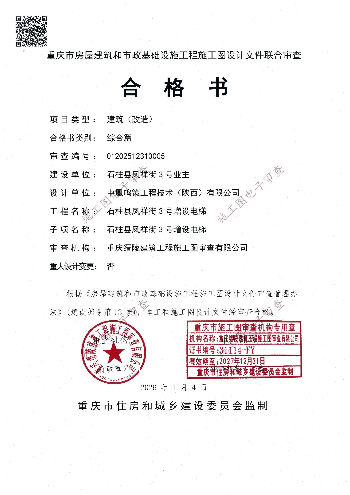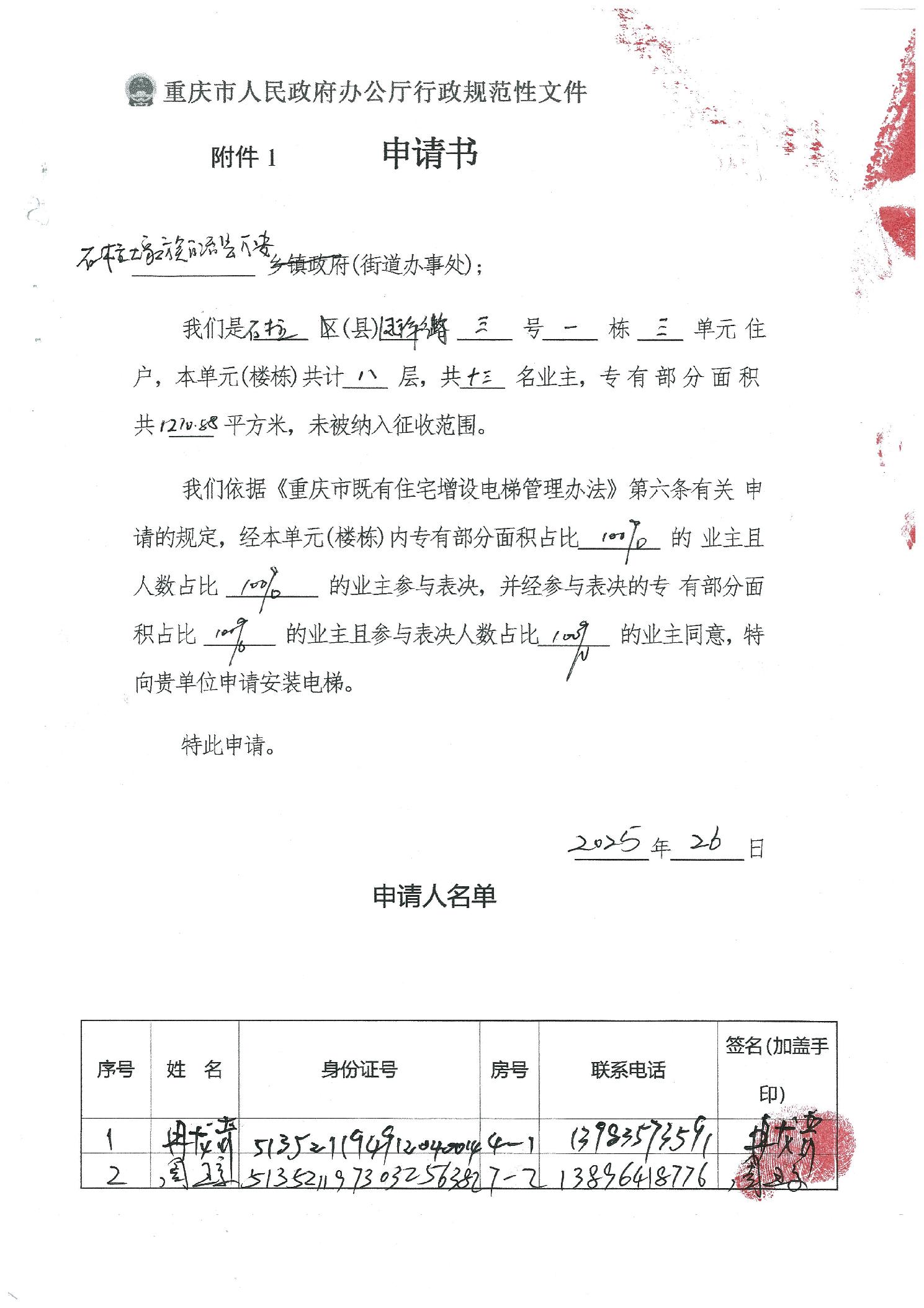 凤祥街3号位于石柱县万安街道下街社区凤祥街,根据《关于印发重庆市既有住宅增设电梯管理办法的通知》(渝府办发〔2023〕70号)文件相关规定,该单元业主向万安街道申请对现有住宅增设电梯,房屋已超过专有部分面积100. %的业主且人数占比100. %的业主同意,通过对申请资料的审核及万安街道办事处、县住建委、县规资局、县市场监管局等相关单位现场踏勘,拟具备增设电梯的条件,现将书面申请、委托授权书等相关资料予以公示(申请资料见附件)。