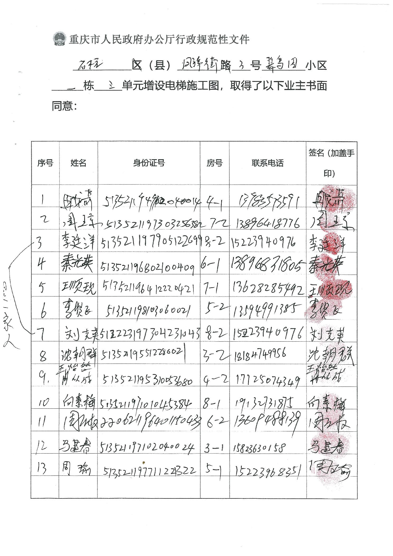 若你单元个人及相关利害关系人如有不同意见和建议,请您及时与本梯号加装电梯委托人(姓名:王顺玖,联系电话:13628285492协商,协商不成的,请以书面形式(注明身份,个人姓名及身份证复印件,联系电话及邮寄地址,提交相关证明涉及利害关系的材料)向石柱县万安街道办事处(城南路1号220规建办公室,联系人:韦老师,联系电话:73200955,邮编:409199)提交书面意见,逾期未提出的,视为同意增设电梯事宜或自动放弃权利。