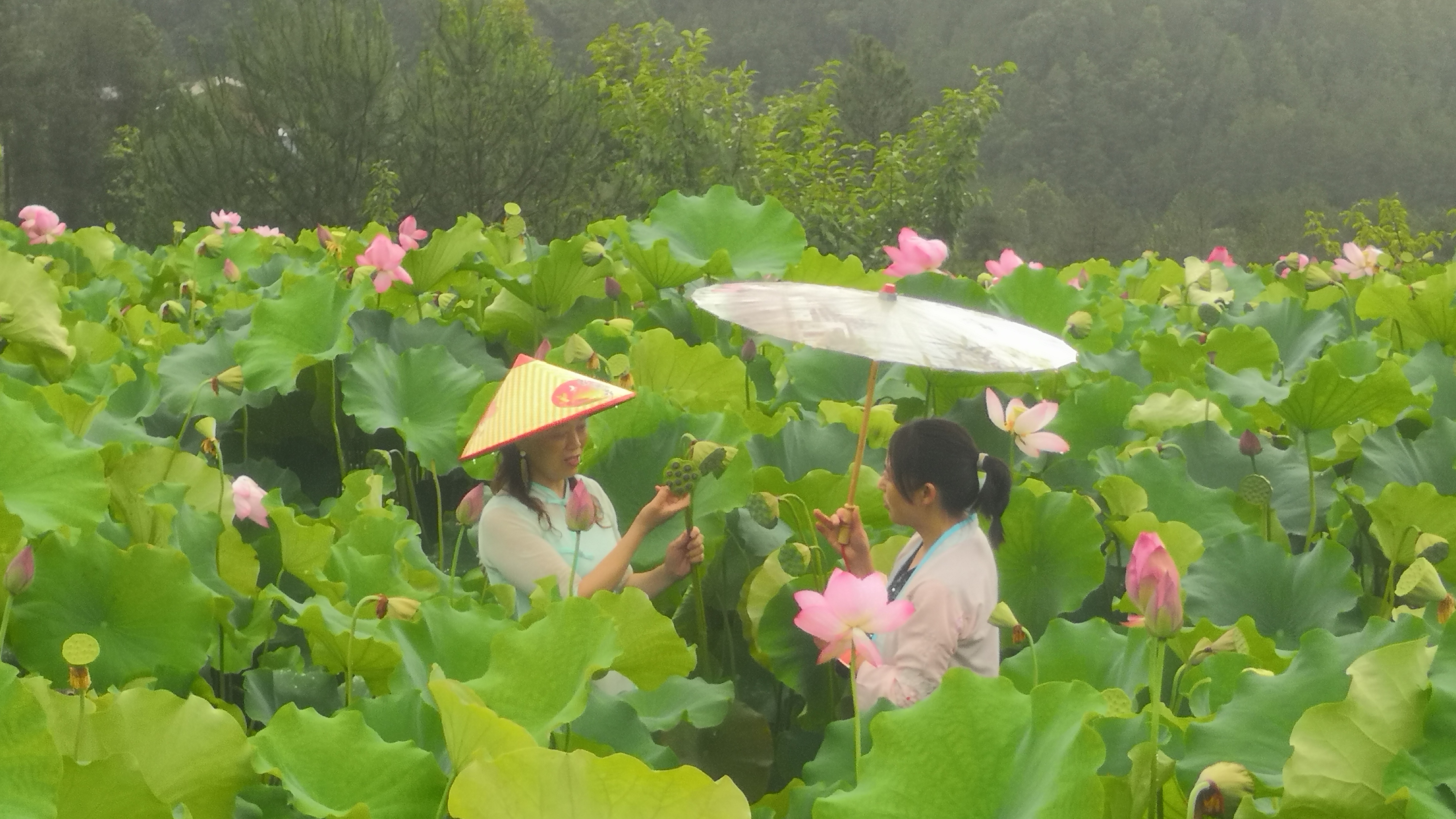 在拥挤的叶和花间,更有一朵朵青蓝色的莲蓬倔强地探出头来,吸盘一样向着天空,在花叶间吸引游客的注意力。这是荷花的瓣儿凋落后,奉献给游客们的礼物。随意摘下一朵,剥开莲蓬,即可取出白生生的莲子,放进口里,就把一畦畦的花叶的清香消化吸收。