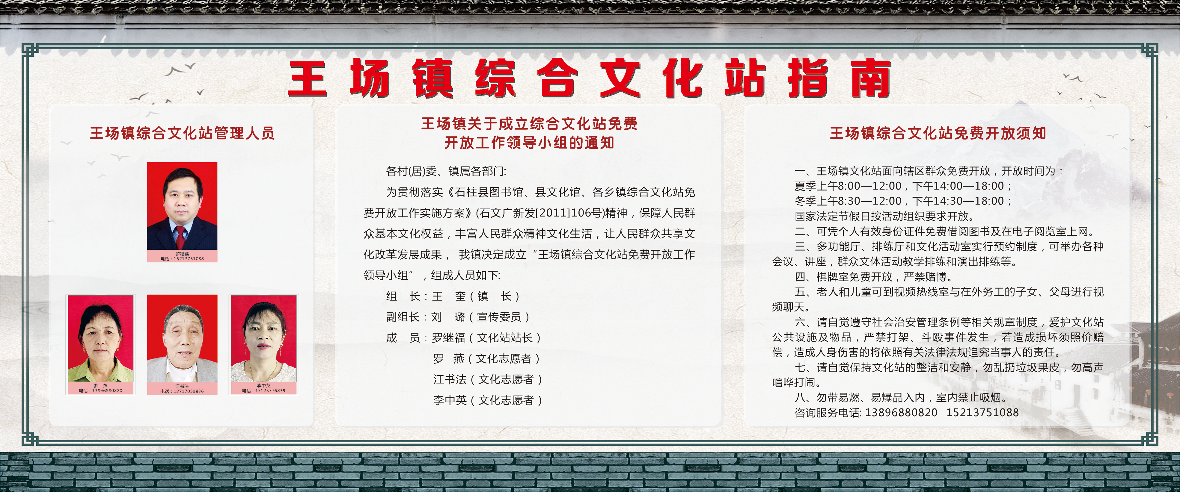 1、开展社会宣传教育,宣传国家方针政策,普及法制教育,传播文化知识和科学技术;2、组织群众公益性文化活动;3、开展阅读指导和读书活动,提供文化信息资源服务,组织建立农村图书和信息服务网络;4、搜集、整理、传承和利用当地非物质文化遗产;5、指导村文化室、社会文艺团队和农民文化户开展文化活动;6、配合当地文化、文物行政主管部门做好文化市场管理和文物保护工作。 |