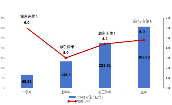 ——经济运行顶压回升,发展态势持续回稳。积极承接中央新一轮增量政策,全面落实经济向上向好“30条”等惠企政策,迭代优化服务企业工作机制,主动靠前服务企业,全年经济增速呈现“高开低走,顶压回升”态势,实现地区生产总值306.83亿元、增长4.8%,增速排全市第23、渝东南第3位。其中:第一产业增加值40.50亿元、增长4.5%,增速排全市第4、渝东南第3位;第二产业增加值82.33亿元、增长3.5%,增速排全市第20、渝东南第3位;第三产业增加值184.00亿元、增长5.4%,增速排全市第24、渝东南第3位。。三次产业结构比由去年的14:27.4:58.6调整为13.2:26.8:60。 完成固定资产投资161.9亿元、增长7%,投资总额居渝东南第1位。全年一般公共预算收入完成21.7亿元、增长24.6%。