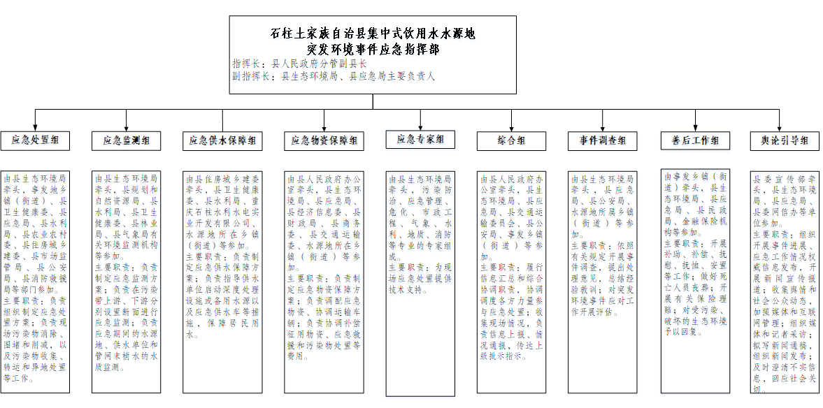 在县人民政府的统一领导下,成立石柱土家族自治县集中式地表水饮用水水源地突发环境事件应急指挥部(以下简称“应急指挥部”),为石柱土家族自治县集中式地表水饮用水水源地突发环境事件应急组织指挥机构。