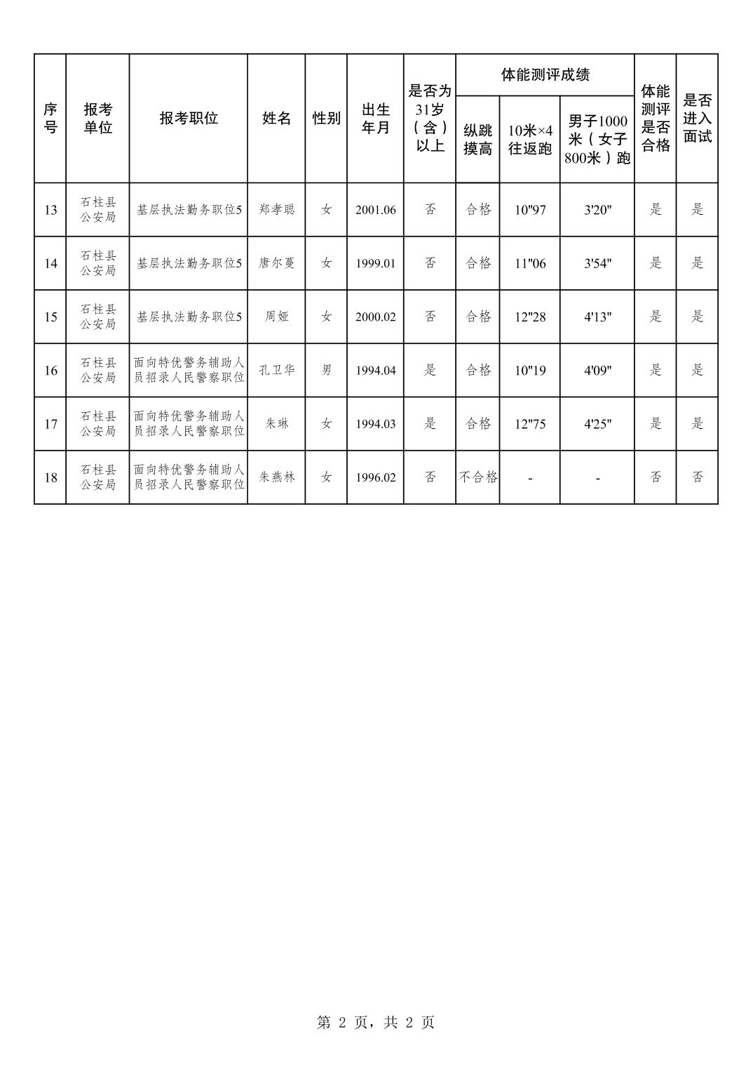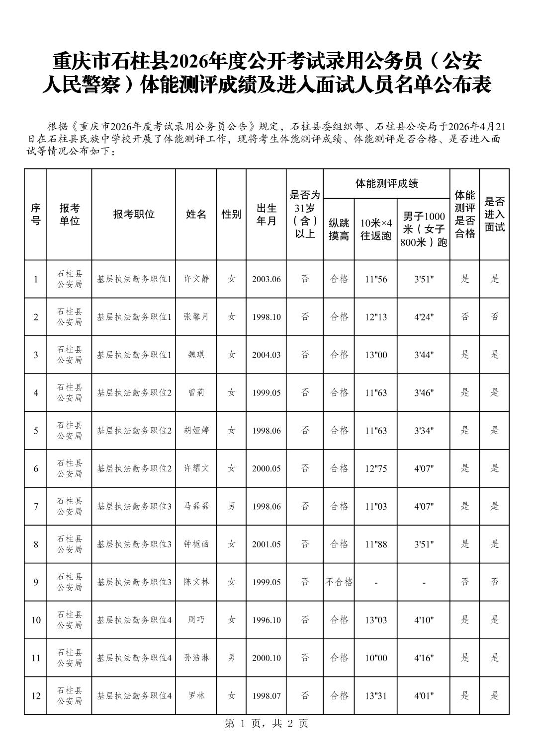 重庆市石柱县2026年度公开考试录用公务员(公安 人民警察)体能测评成绩及进入面试人员名单公布表