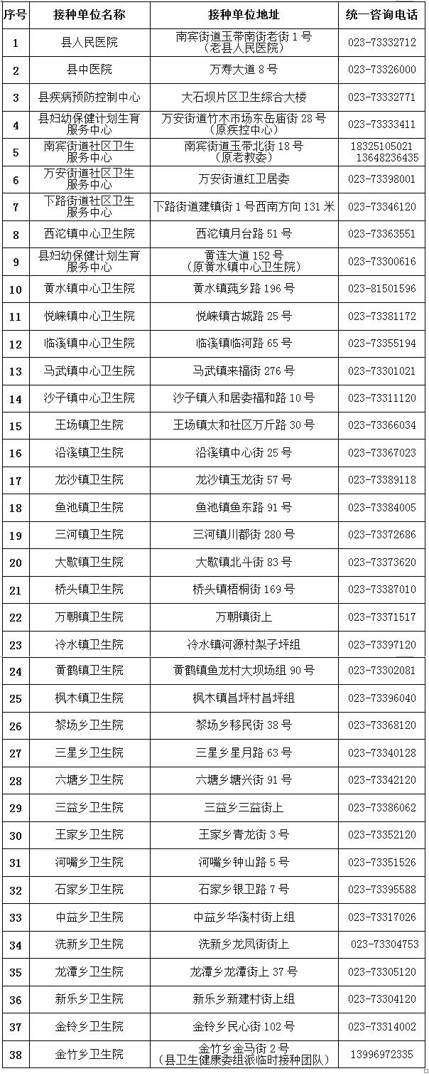 石柱县新冠病毒疫苗接种门诊公示