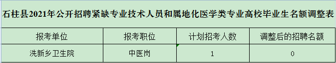 按照2021年12月20日发布的《重庆市石柱县基层医疗卫生机构2021年公开招聘紧缺专业技术人员和属地化医学类专业高校毕业生简章》中“未达到开考比例人员的处理”有关规定,根据本次招聘各岗位报名情况,岗位需求及人才紧缺程度,经报市级事业单位人事综合管理部门备案同意,现对有关岗位的招聘名额进行调整如下。
