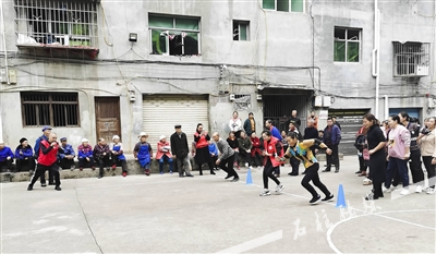 在悦崃镇,县体育运动中心志愿者与当地群众一起进行短跑接力赛、拔河比赛、广场舞教学等活动,之后还现场进行体育健身示范教学。