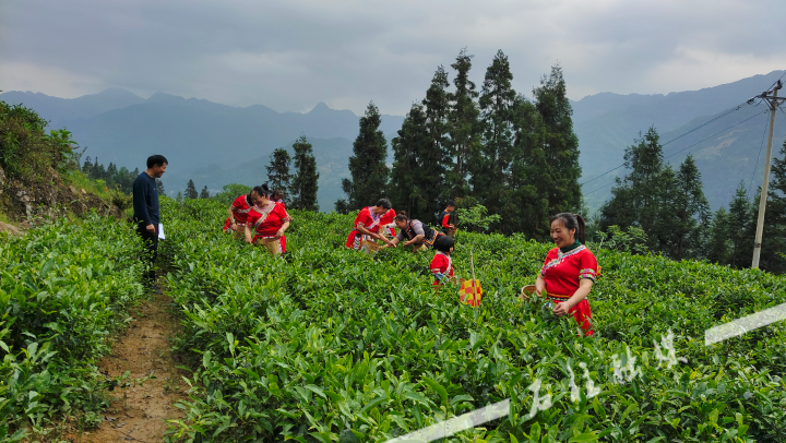高山春露早,茗树发新芽。乐坏红衣女,箩筐载满茶。农历闰二月盛春,黄鹤镇汪龙村王益彬家中的400多亩茶树陆续冒出嫩绿的新芽,焕发出勃勃生机,穿着土家服饰的茶女们穿梭其间,采茶理树,形成了一道靓丽的风景线。