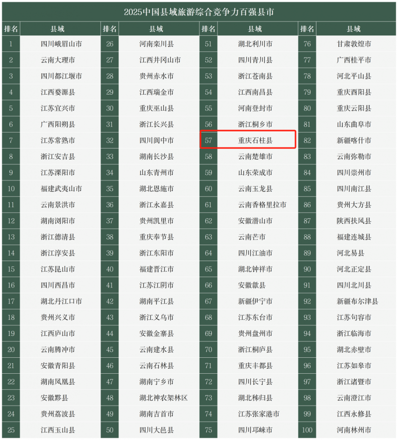 我县成功入选2025中国县域旅游综合竞争力百强县市