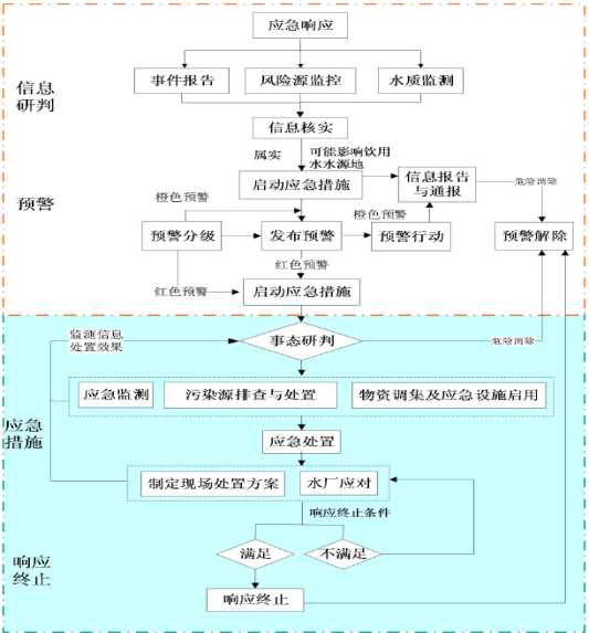 橙色预警:当污染物迁移至水源地应急预案适用范围,但水源地保护区或其上游连接水体尚未受到污染,或是污染物已进入水源保护区上游连接水体,但应急专家组研判认为对水源地水质影响可能较小、可能不影响取水时,为橙色预警。